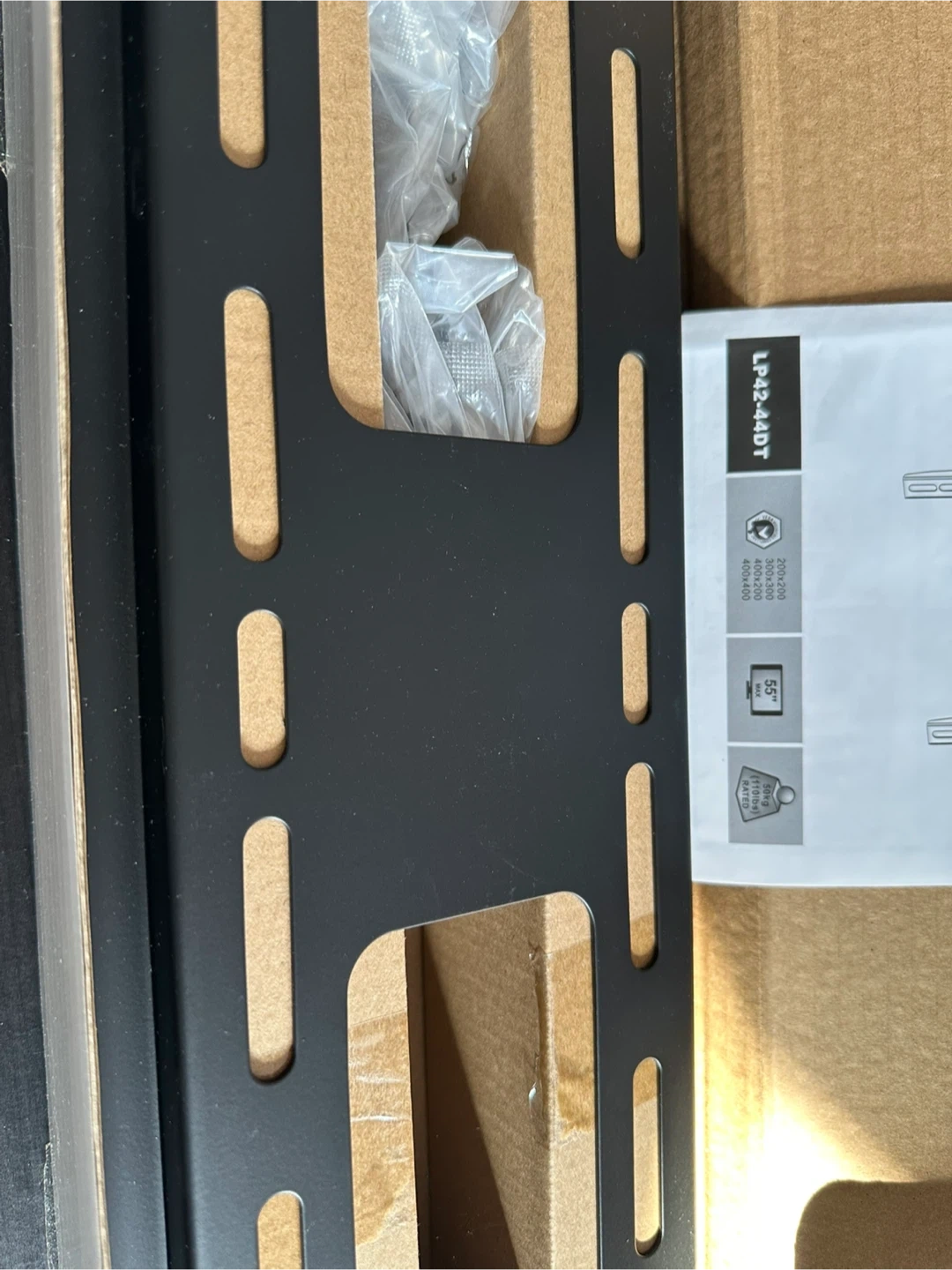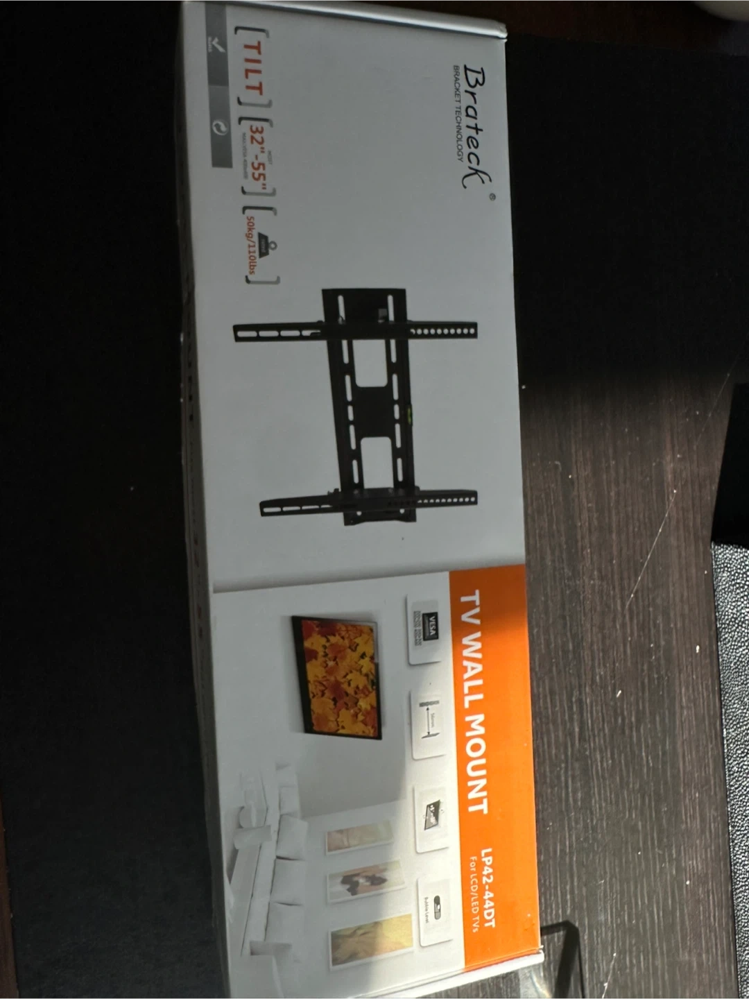 This is a Brateck tilt wall mount designed for 32" to 55" flat panel TVs. It supports VESA mounting patterns up to 400x400mm and has a weight capacity of 30kg (66lbs). Includes installation manual.