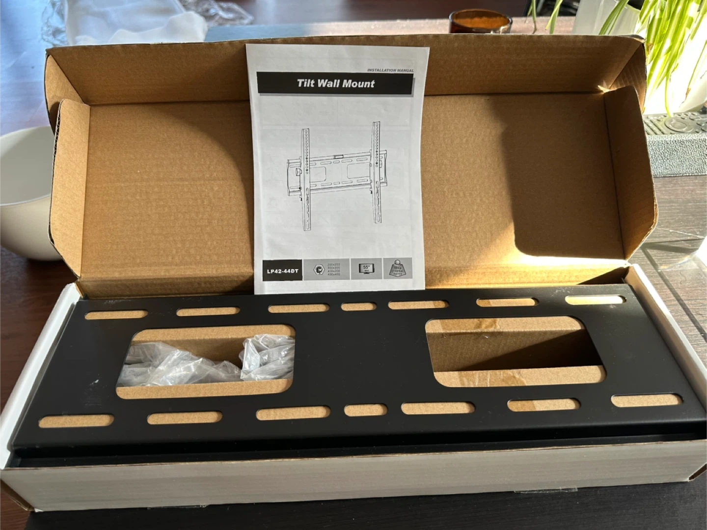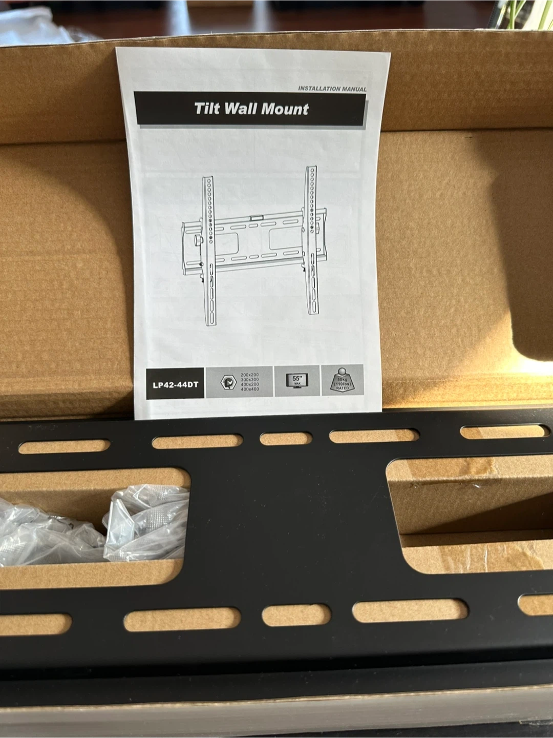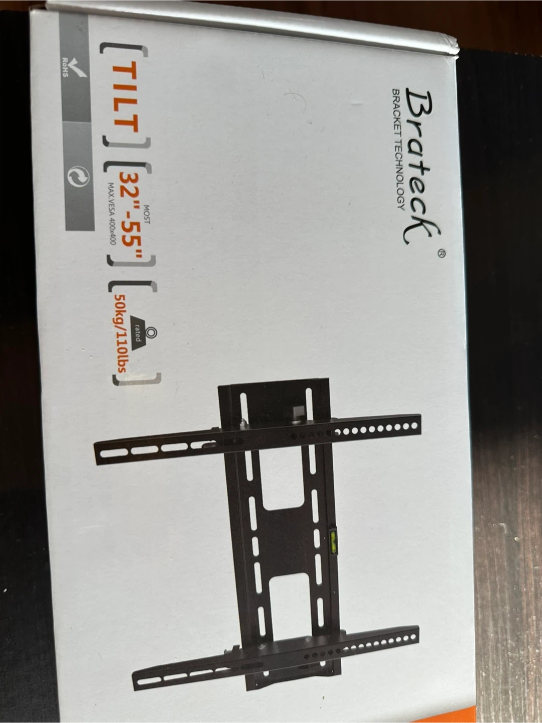 This is a Brateck tilt wall mount designed for 32" to 55" flat panel TVs. It supports VESA mounting patterns up to 400x400mm and has a weight capacity of 30kg (66lbs). Includes installation manual.