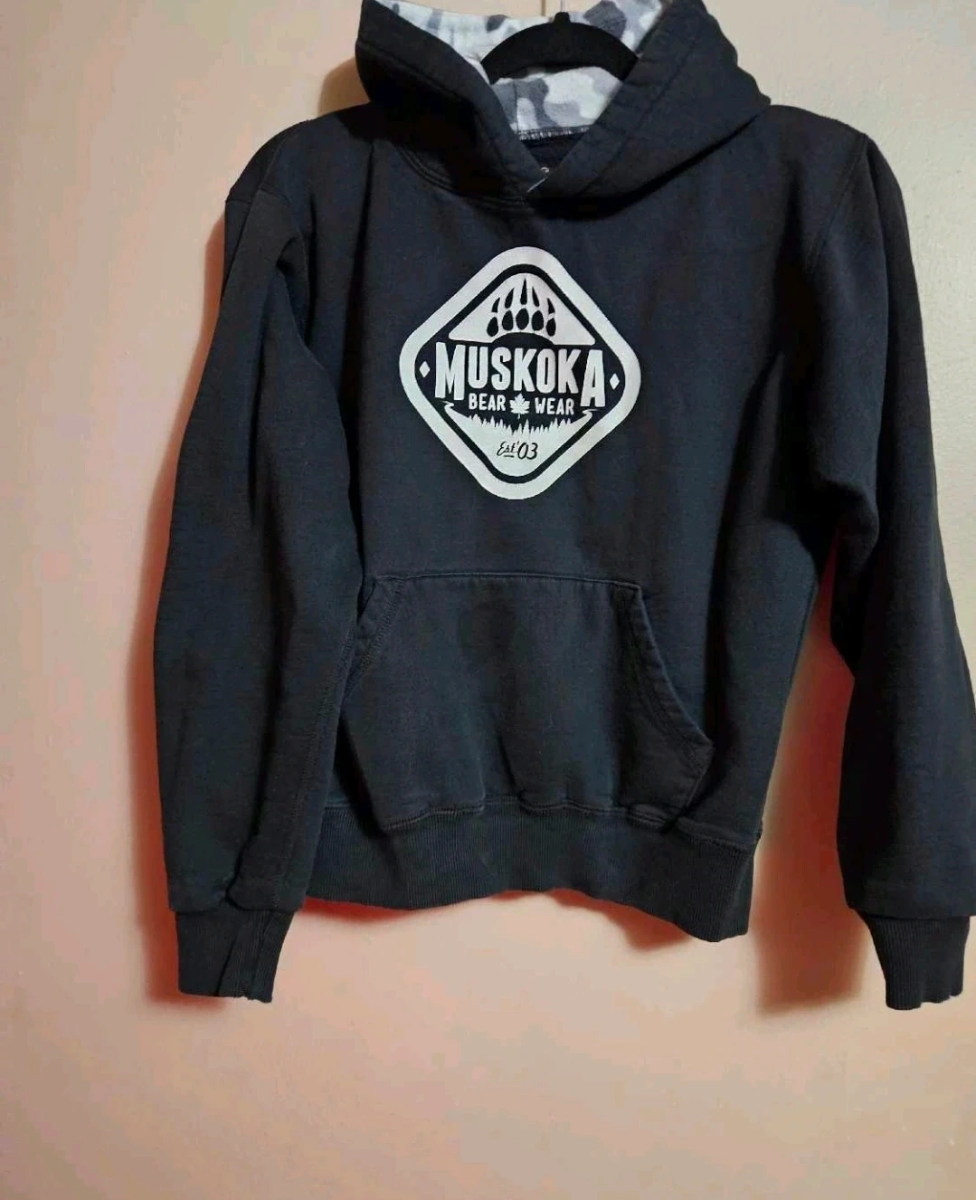 Boys youth sz XL ( fits more like a L) Muskoka Bear Wear hoodie. It's a pullover style with a front pocket. The interior of the hood has a camouflage pattern.