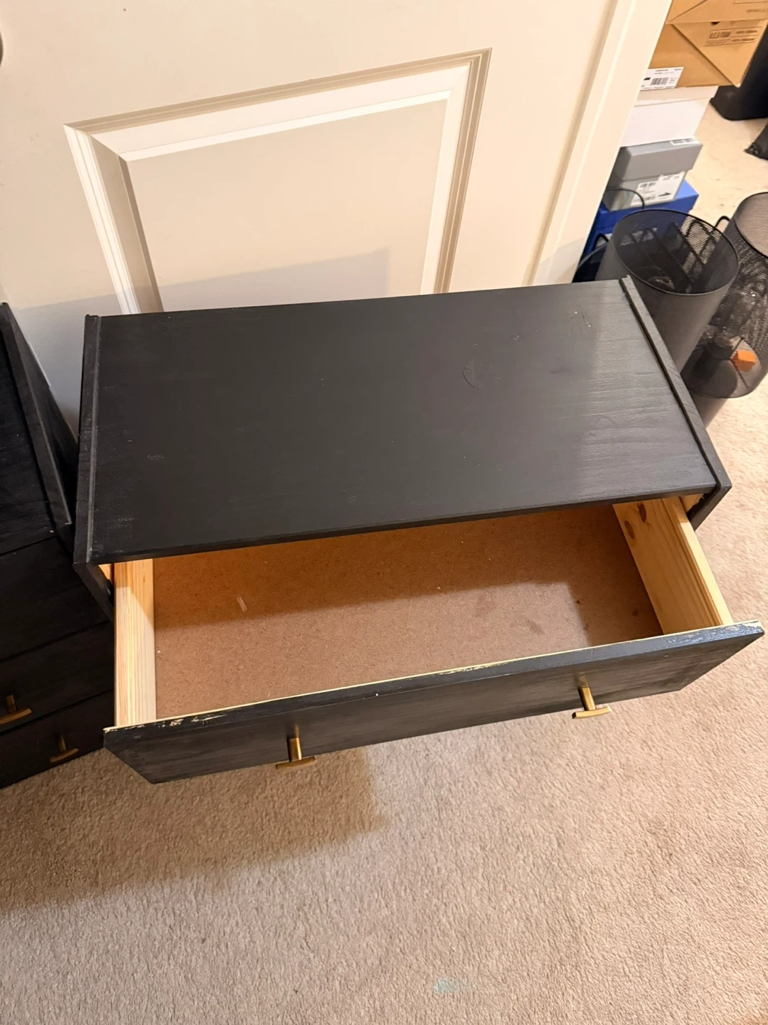 This black dresser has three drawers with modern gold handles. Its compact size makes it versatile for various rooms. Perfect for storing clothes or other household items!