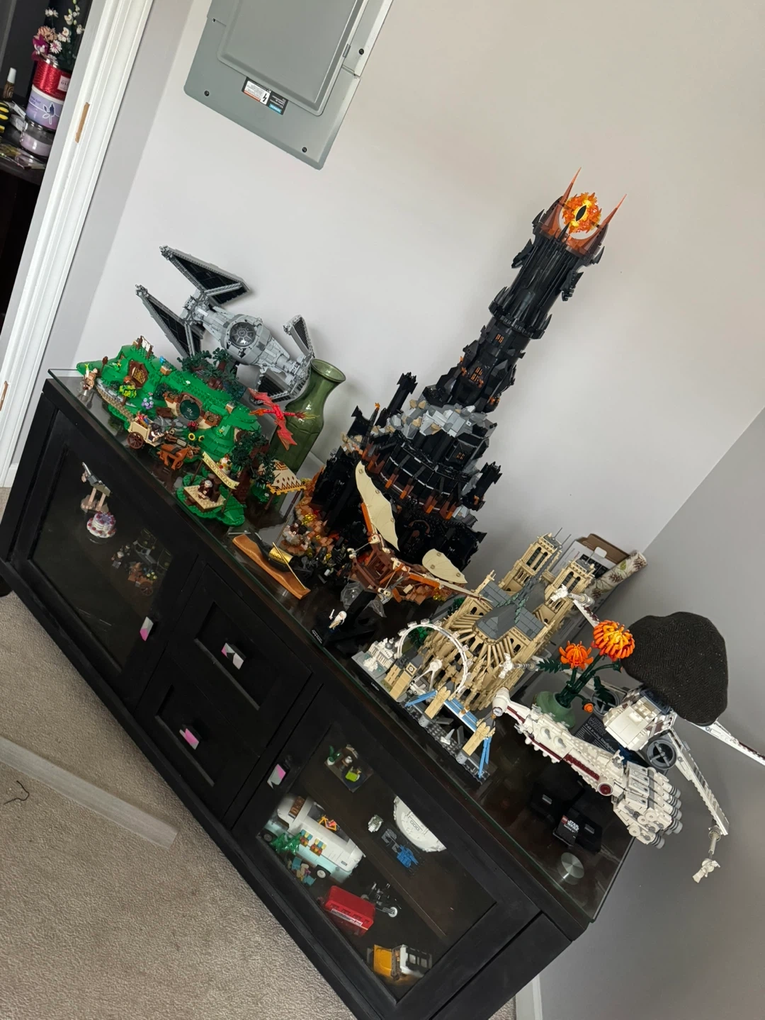 • Enclosed cabinets with glass panels for visible storage and 2 drawers