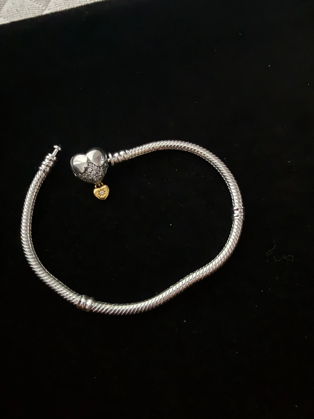 Pandora sterling silver snake chain bracelet with a heart-shaped charm. The charm has "Never give up on your dreams" inscribed on it and a small gold-tone heart dangle. Includes original Pandora box.
