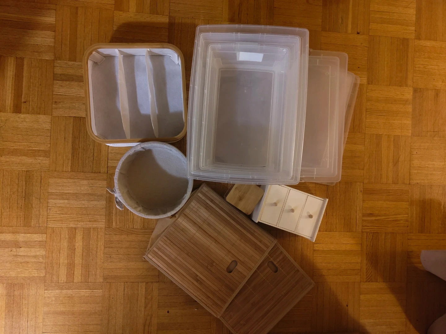 A collection of various storage containers including plastic lidded boxes, a fabric-lined round basket, a bamboo lidded box, and a divided organizer. Perfect for decluttering various spaces in your home!