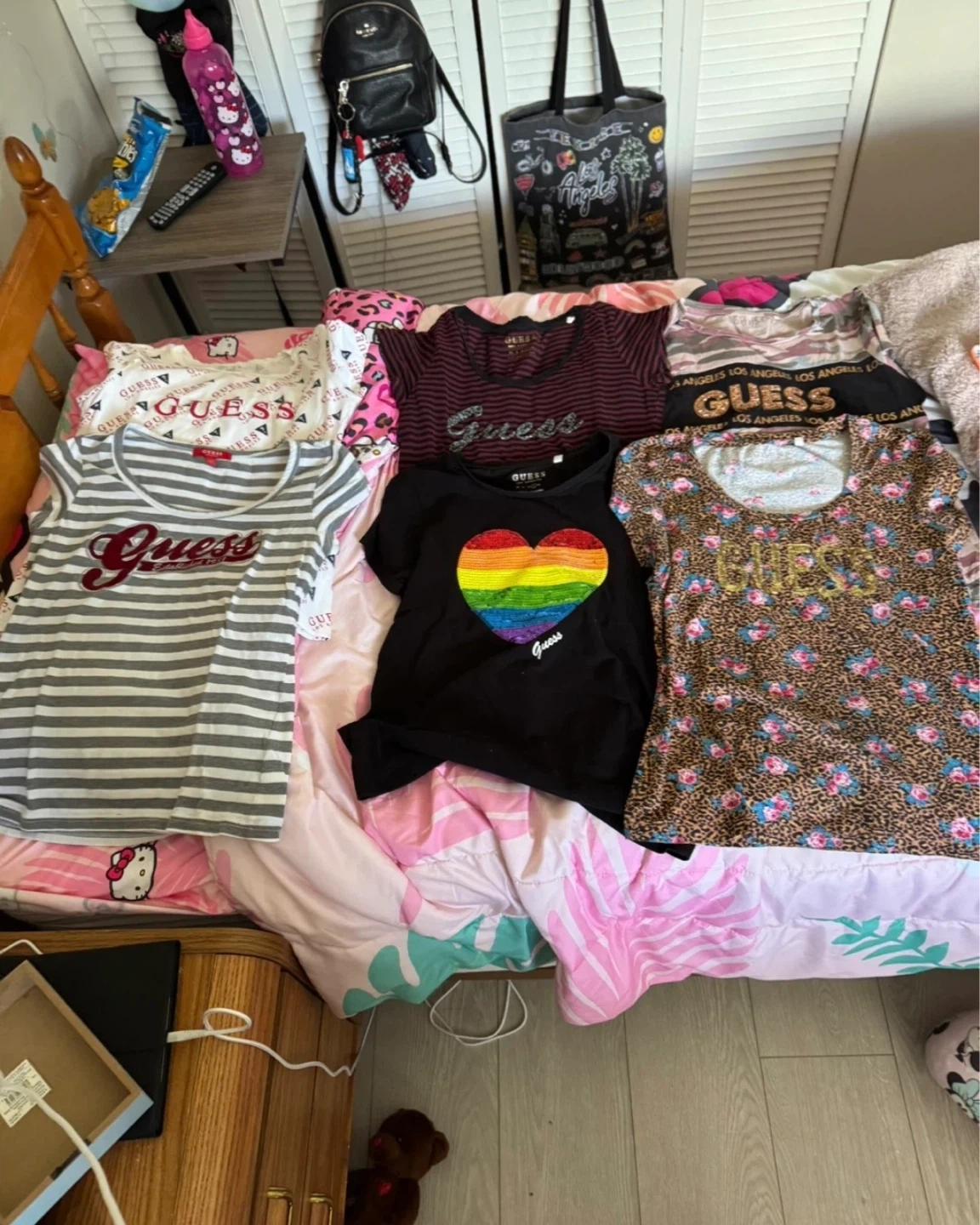 A collection of Guess tops. Includes a striped long-sleeve, a black rainbow heart shirt, a striped short-sleeve, and a leopard print floral shirt. All are branded Guess. These tops are great for casual wear.