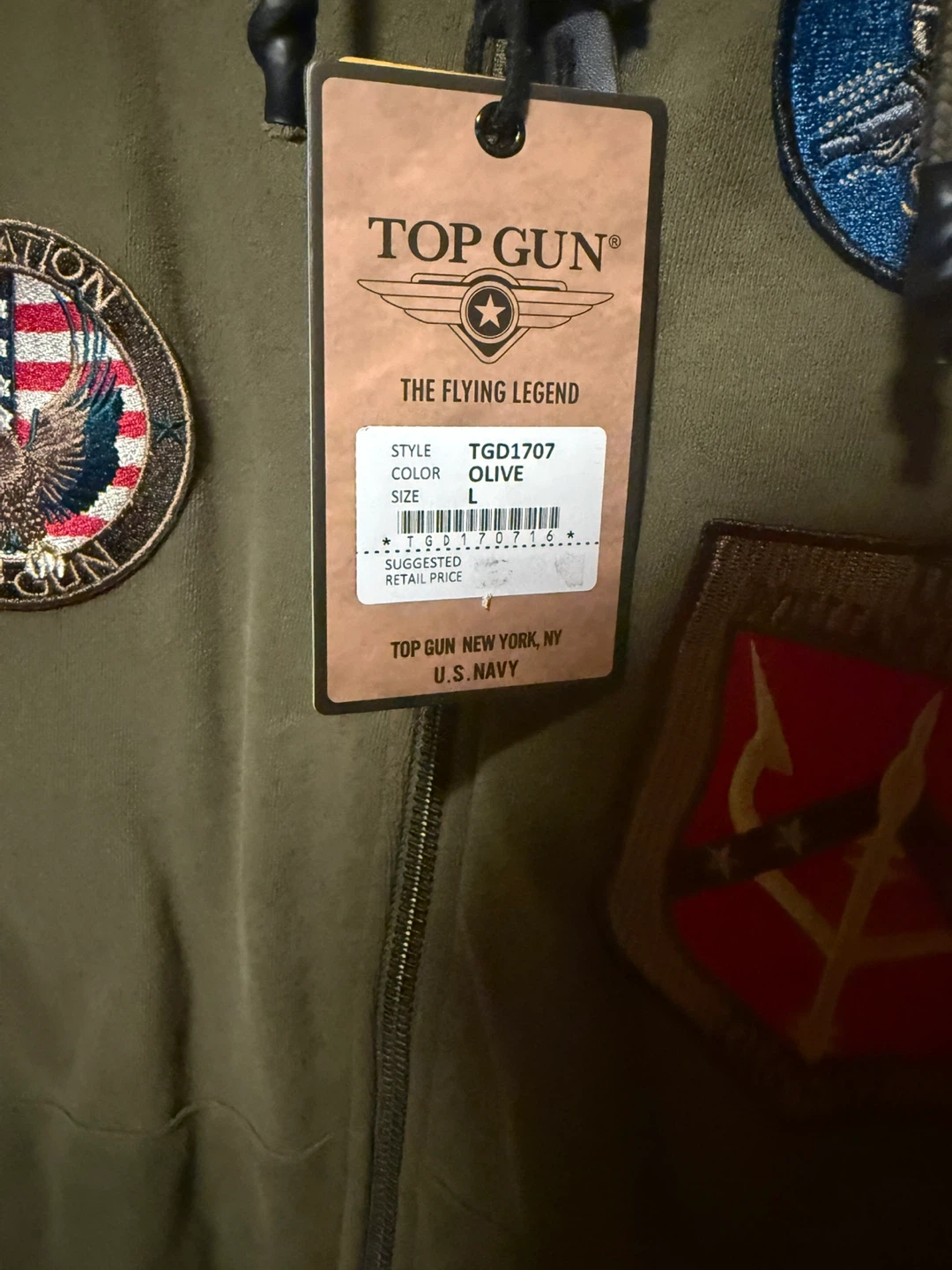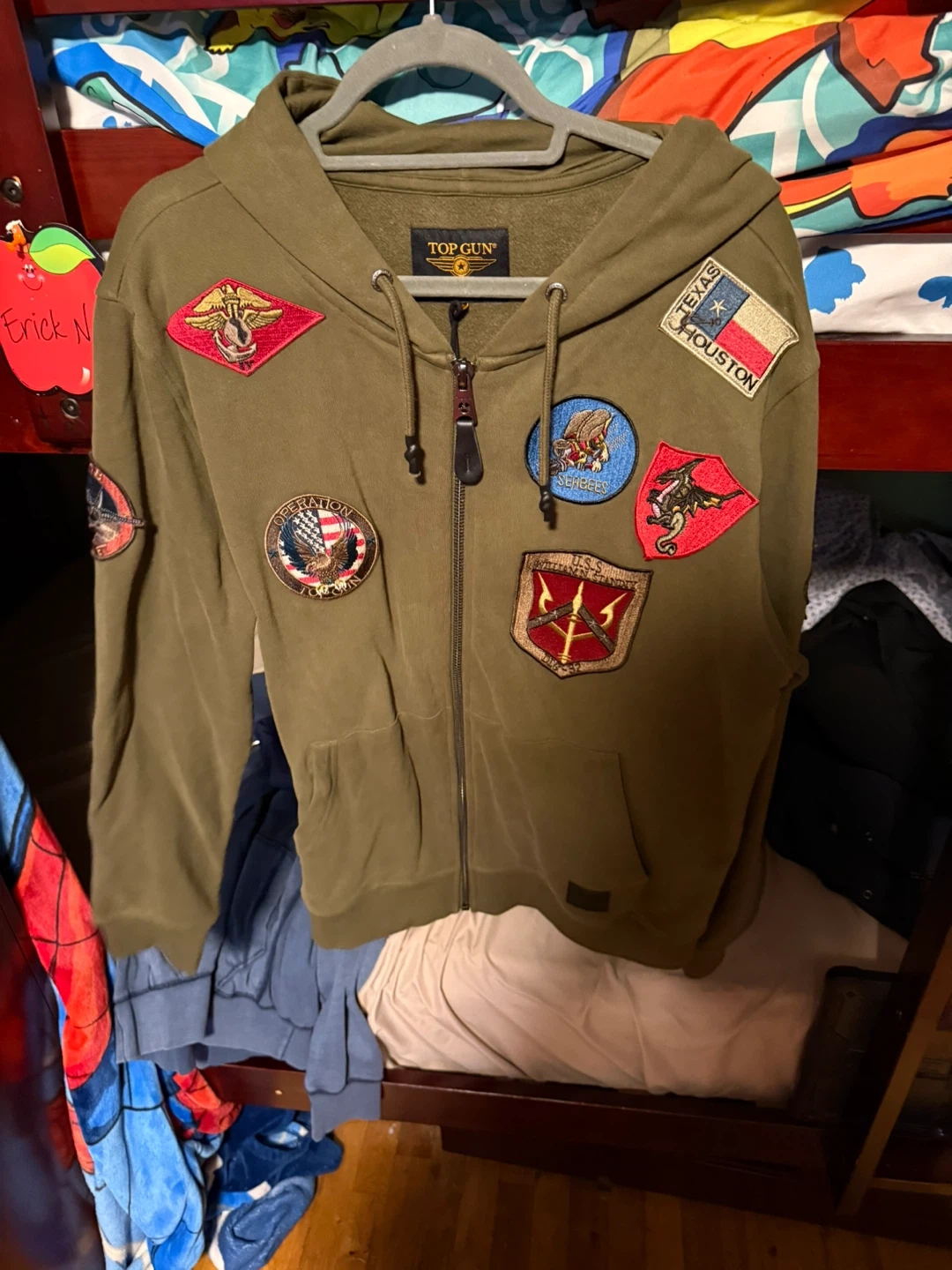 This Top Gun zip-up hoodie is olive colored and features several embroidered patches. It's a size large. Made for "The Flying Legend".