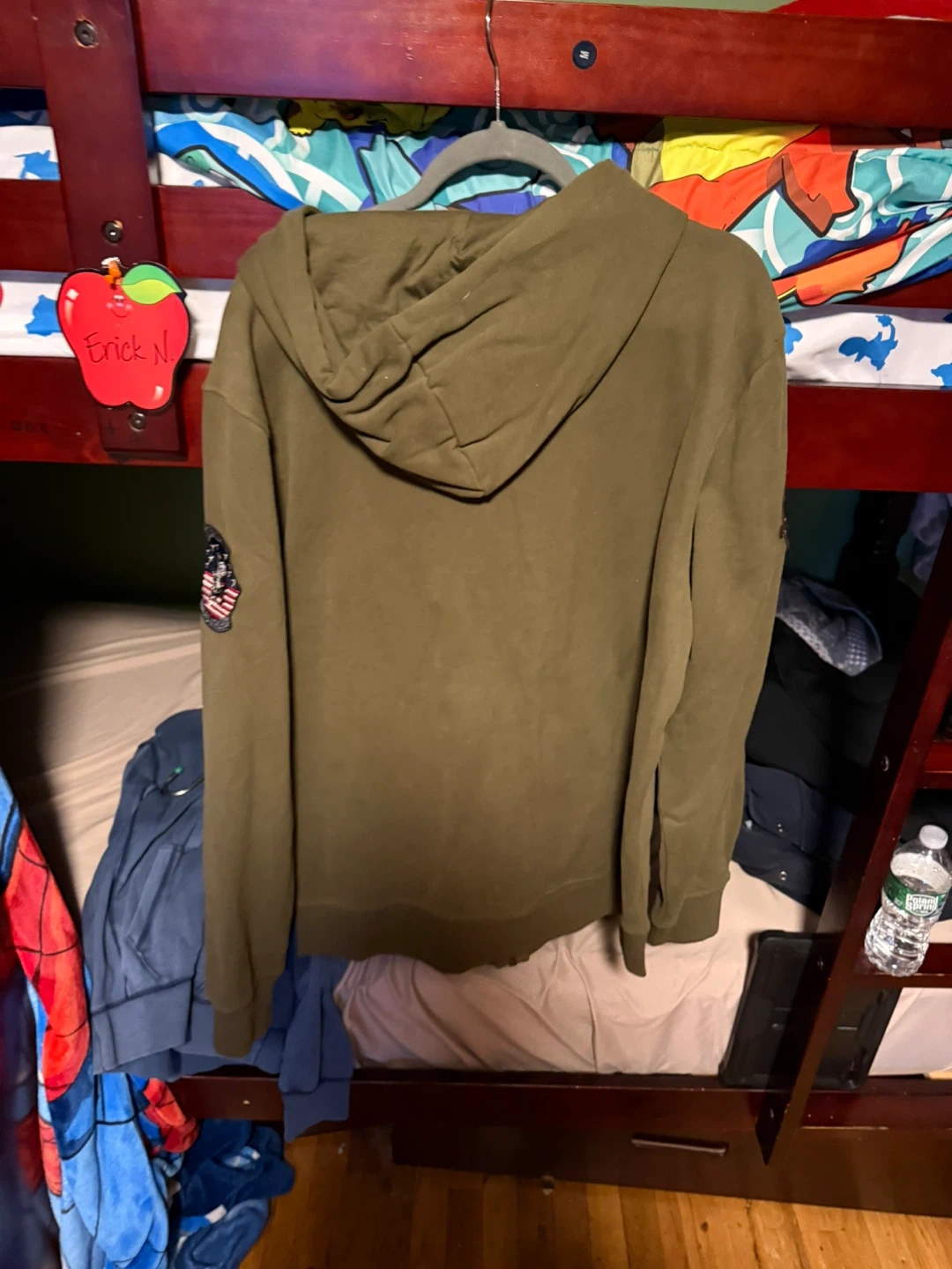 This Top Gun zip-up hoodie is olive colored and features several embroidered patches. It's a size large. Made for "The Flying Legend".