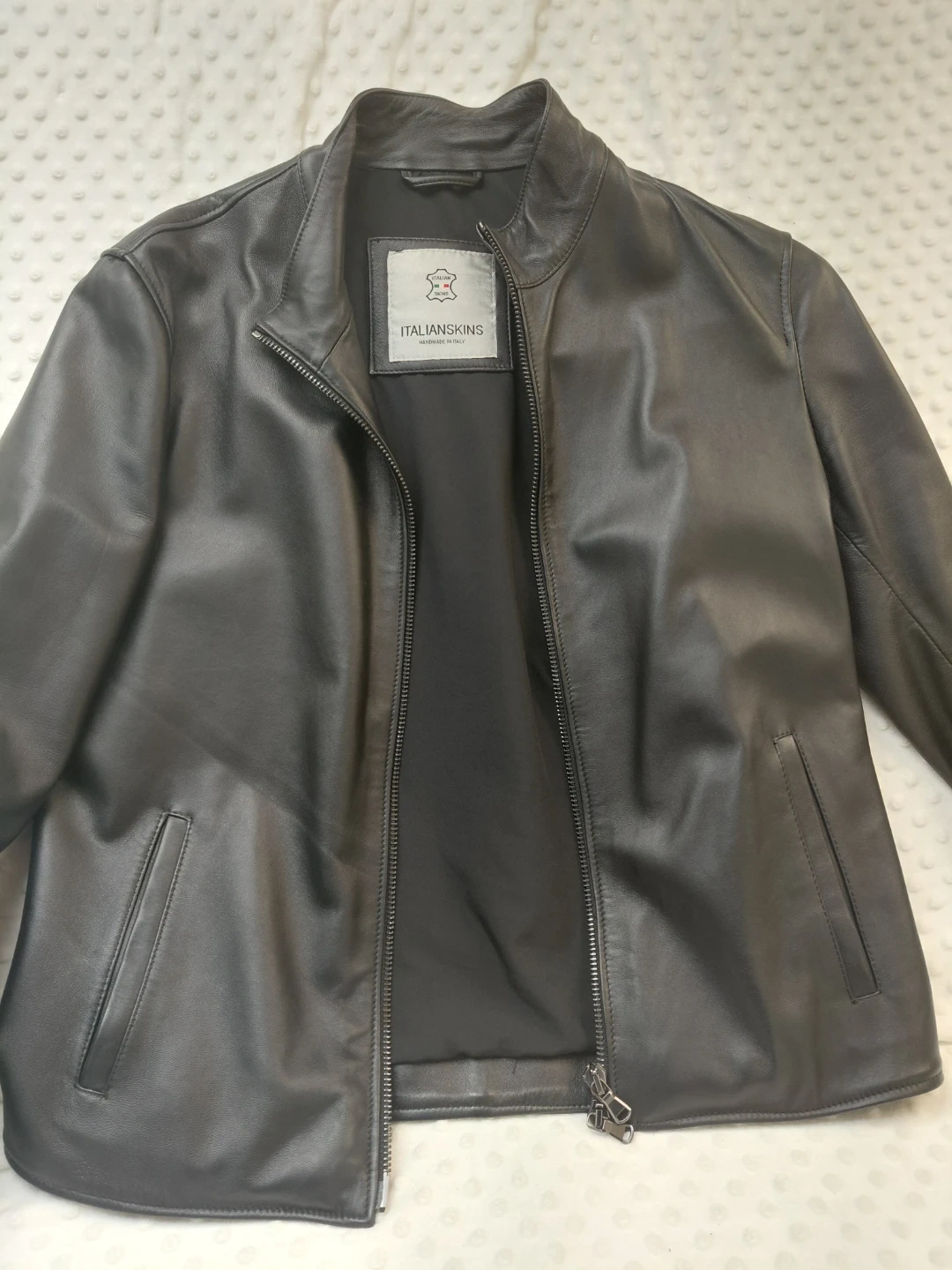 This ITALIANSKINS jacket is handmade in Italy. It features a shell made of 100% lamb leather and a lining of 100% viscose. It's a size medium. This jacket would be useful for a stylish outerwear option.