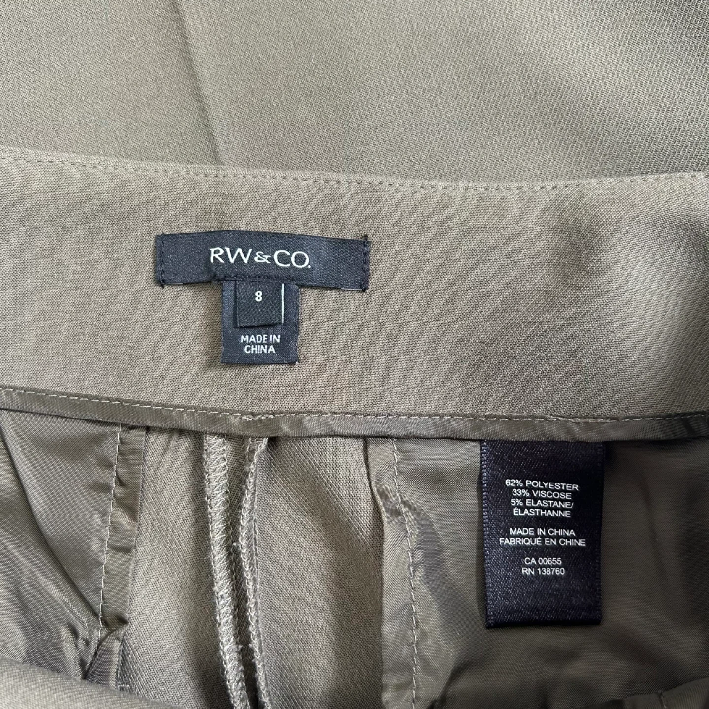 These RW&CO. dress pants are a size 8 in a lovely olive green colour. They're made with 62% polyester, 35% viscose, and 3% elastane. These pants would be great for work or a night out!