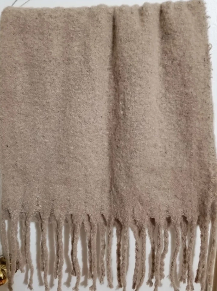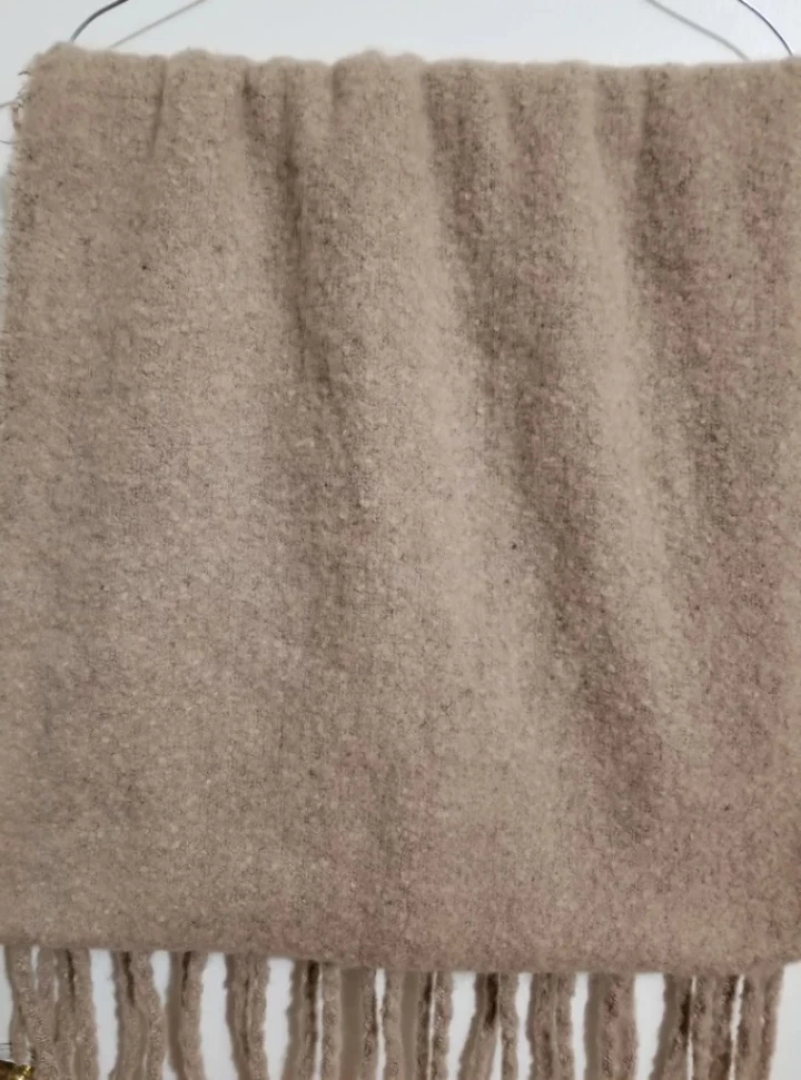 Selling a cozy beige scarf with fringe detailing! It's in great condition and perfect for keeping warm on chilly days. The material feels soft and comfortable against the skin, making it a great accessory for any outfit.