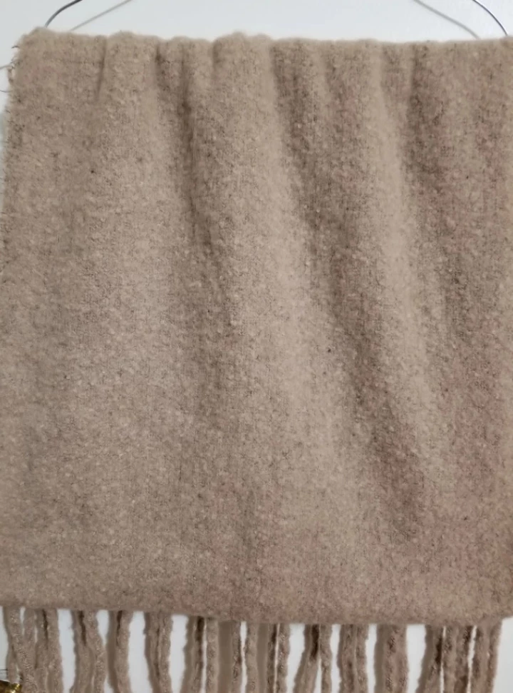Selling a cozy beige scarf with fringe detailing! It's in great condition and perfect for keeping warm on chilly days. The material feels soft and comfortable against the skin, making it a great accessory for any outfit.