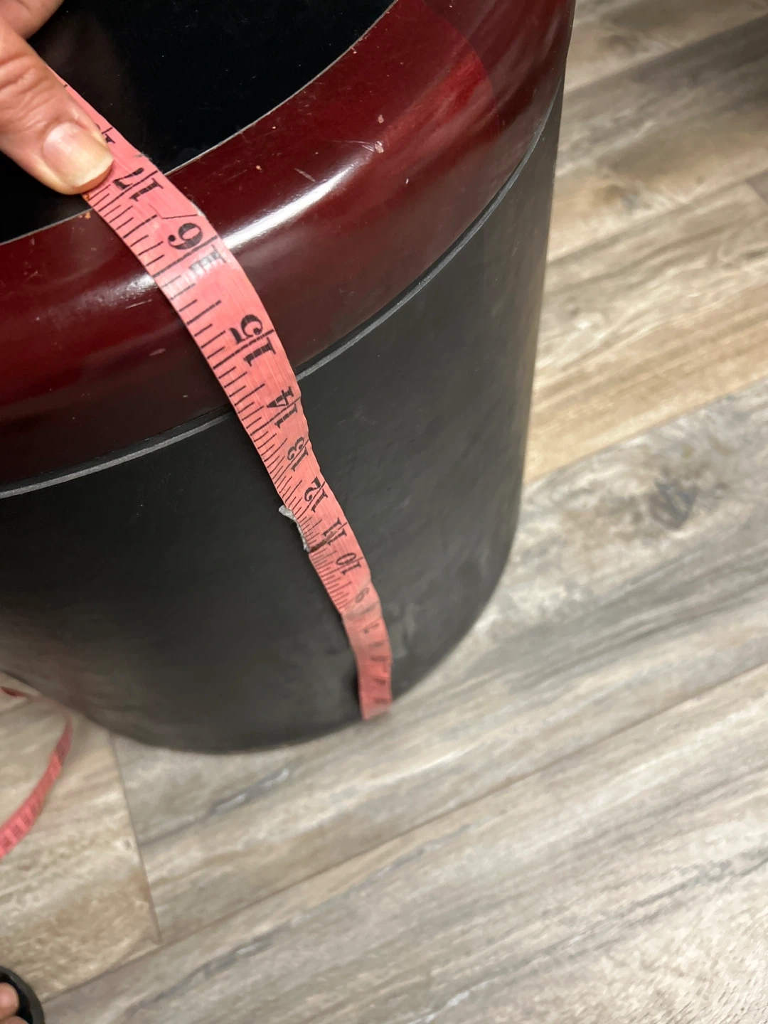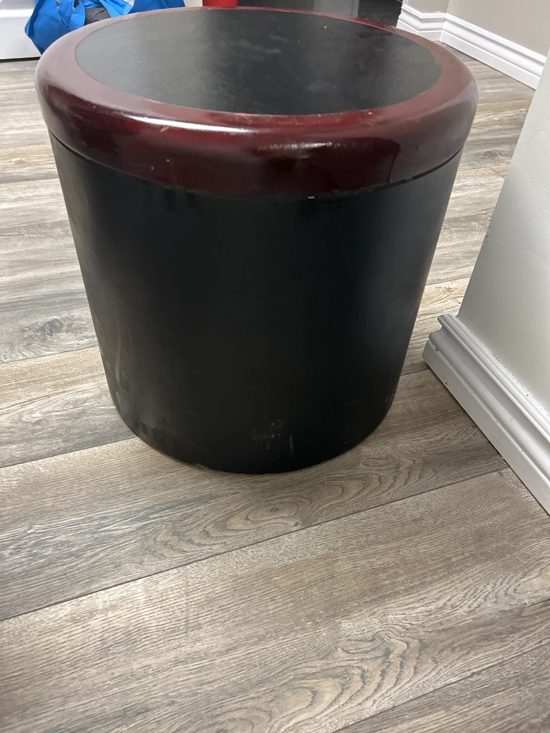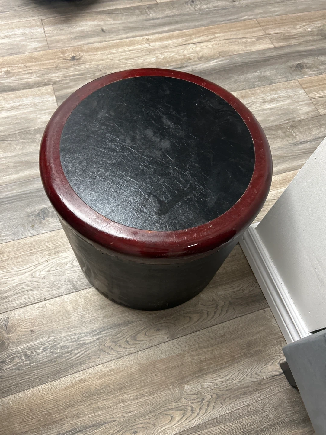 This round stool or side table features a black top and a dark red wood-look trim. It's approximately 15 inches tall. It has a black cylinder base and a dark wood-tone accent rim. Perfect as a small side table or extra seating!