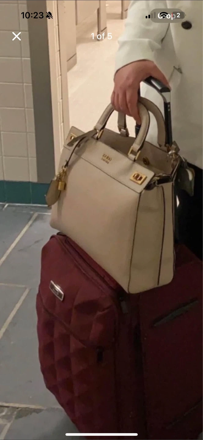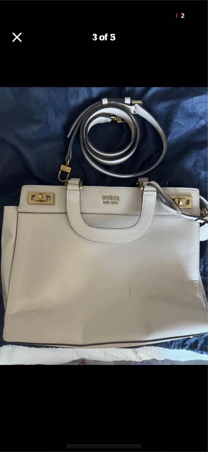 This is a stylish Guess satchel handbag in a neutral beige color. It includes a detachable shoulder strap for versatile carrying options. The bag features a secure zip closure to keep your belongings safe.
