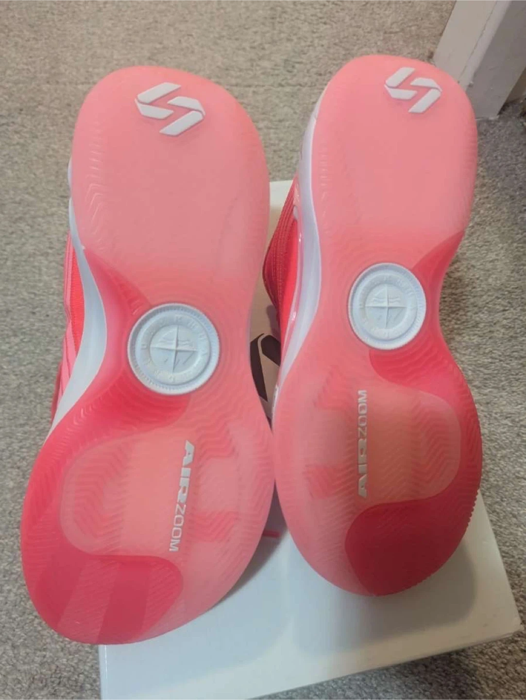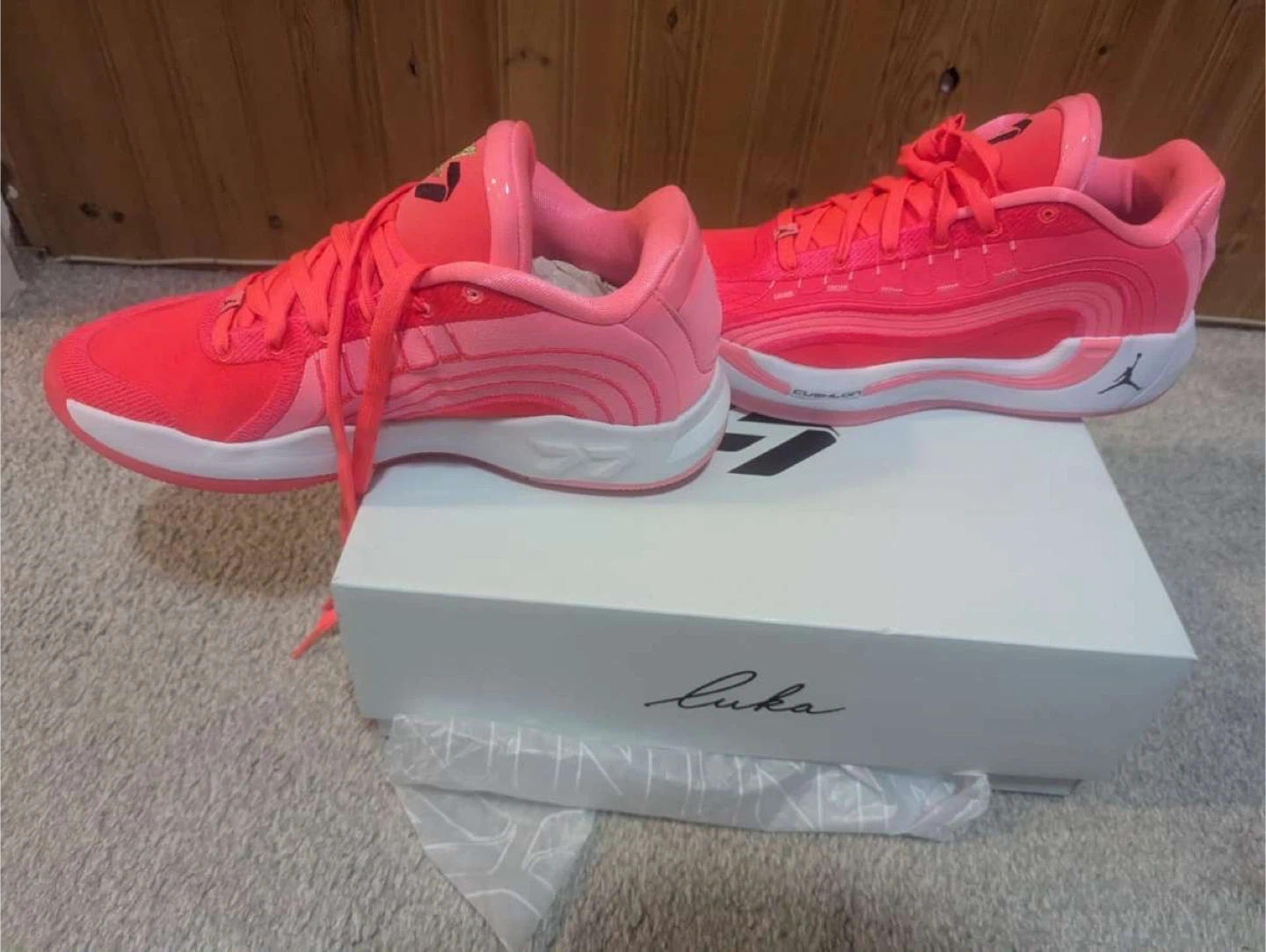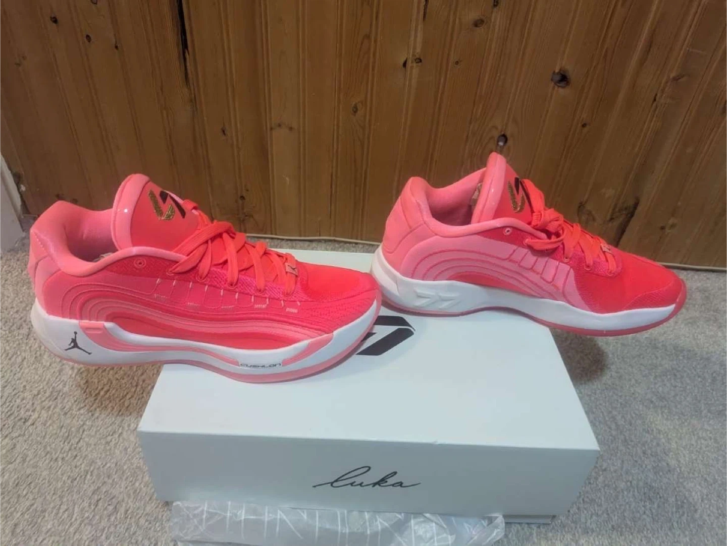 These are Luka 4 basketball shoes in a vibrant pink and coral colourway. They feature Air Zoom cushioning and come in the original box. Designed for performance on the court!