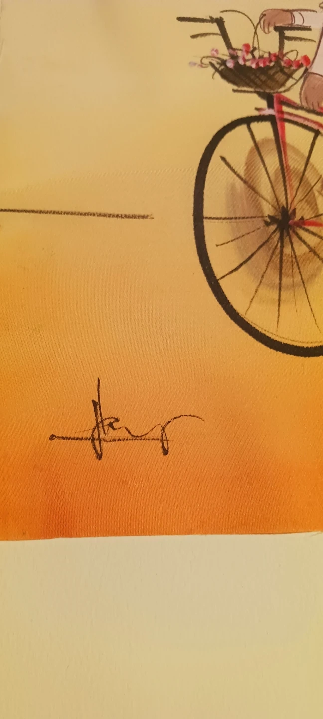 two women with conical hats riding bicycles in a landscape setting. The painting is signed. IT IS NOT FRAMED, SELLING AS IS, WITHOUT FRAME. 20"×16". Excellent condition. ALL MY PRICES ARE NEGOTIABLE !! BEST OFFER !!