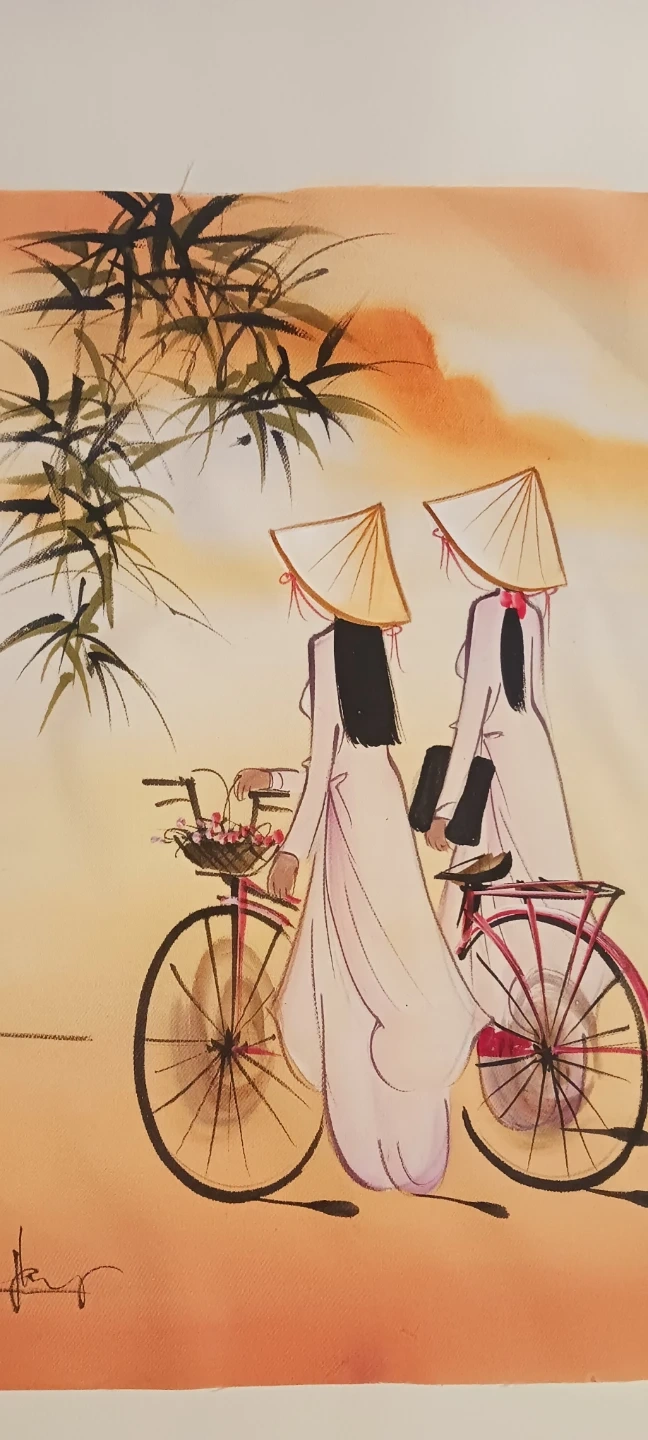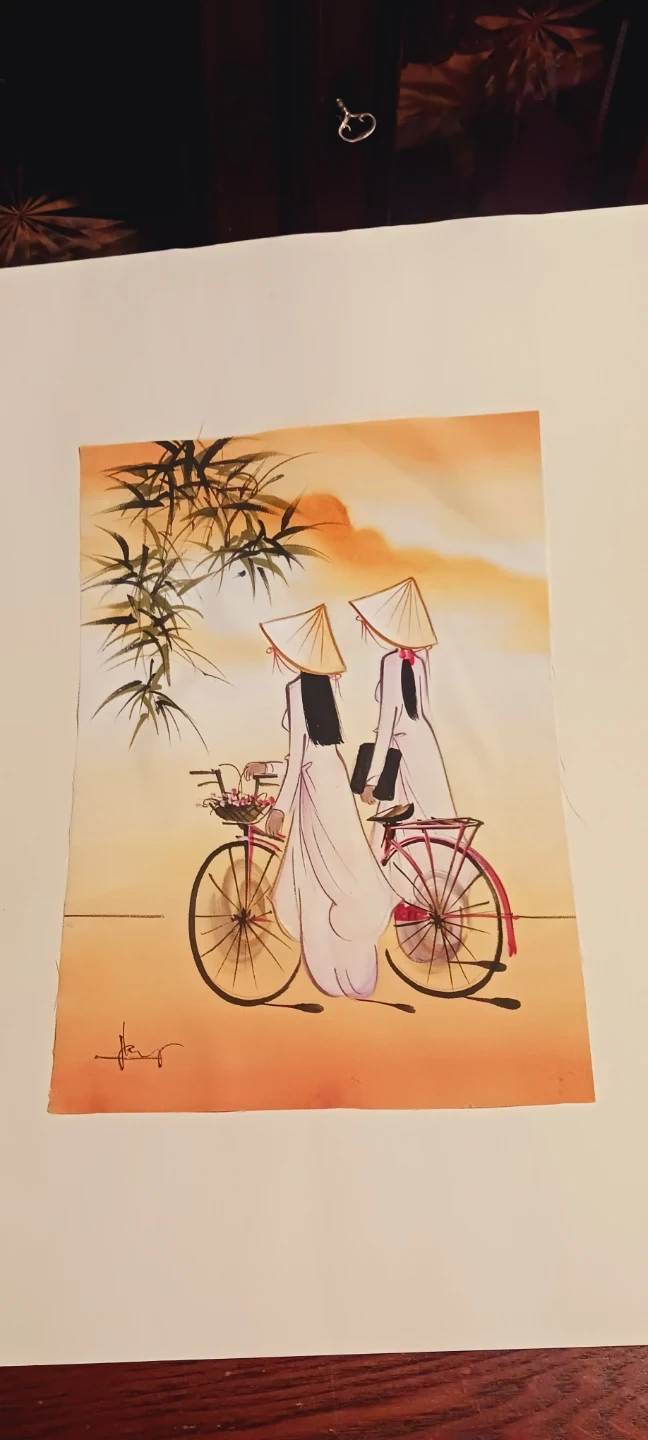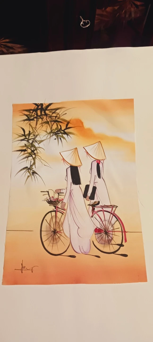 two women with conical hats riding bicycles in a landscape setting. The painting is signed. IT IS NOT FRAMED, SELLING AS IS, WITHOUT FRAME. 20"×16". Excellent condition. ALL MY PRICES ARE NEGOTIABLE !! BEST OFFER !!