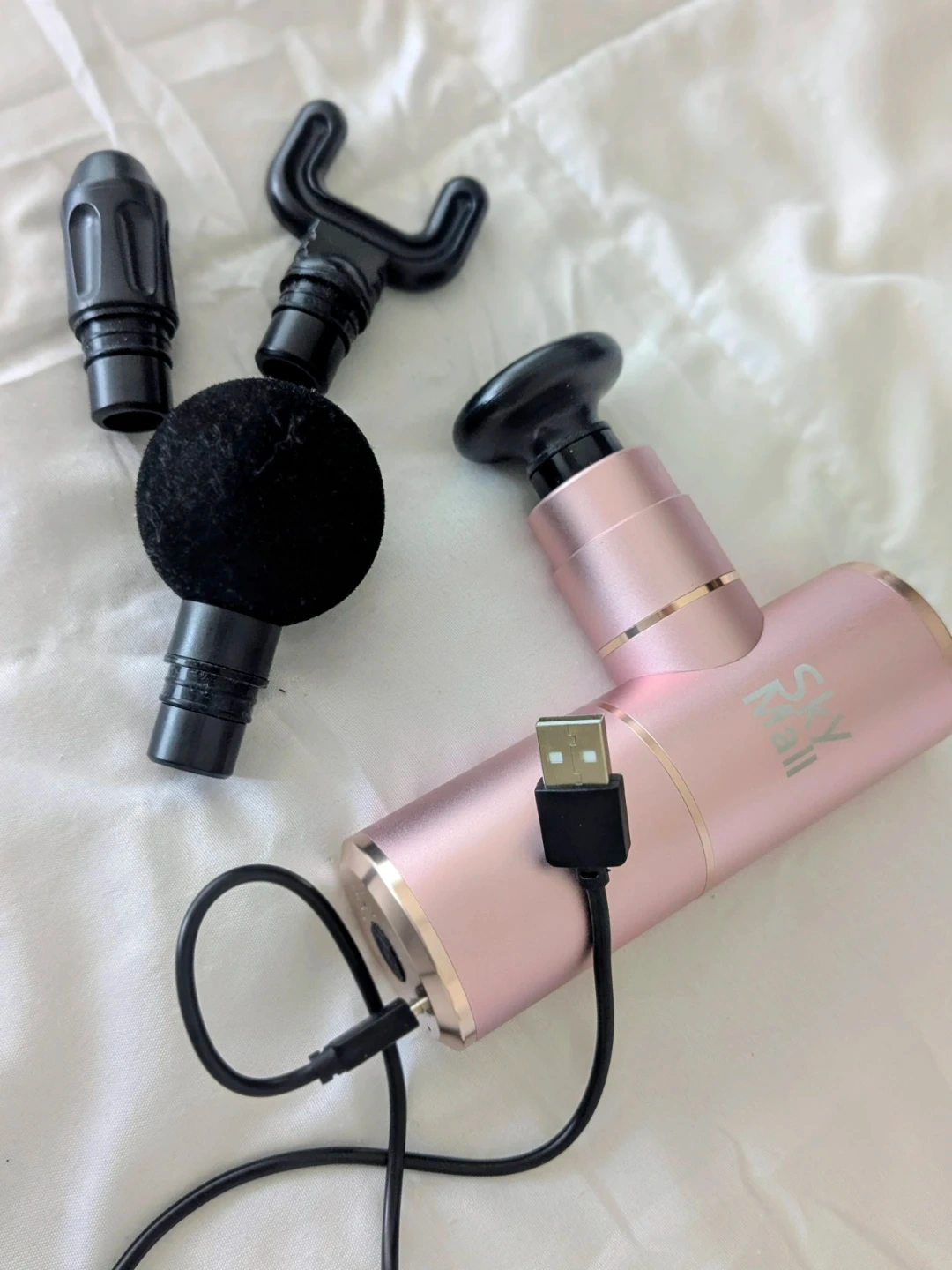 This is a Sky Mall mini massage gun in a lovely pink colour. It comes with multiple attachments for different massage needs. It's rechargeable via USB.
