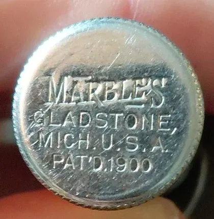 This is a vintage Marbles pocket match safe, made in Gladstone, Michigan, U.S.A. It's stamped "PAT'D. 1900". This is a collectible piece for enthusiasts.