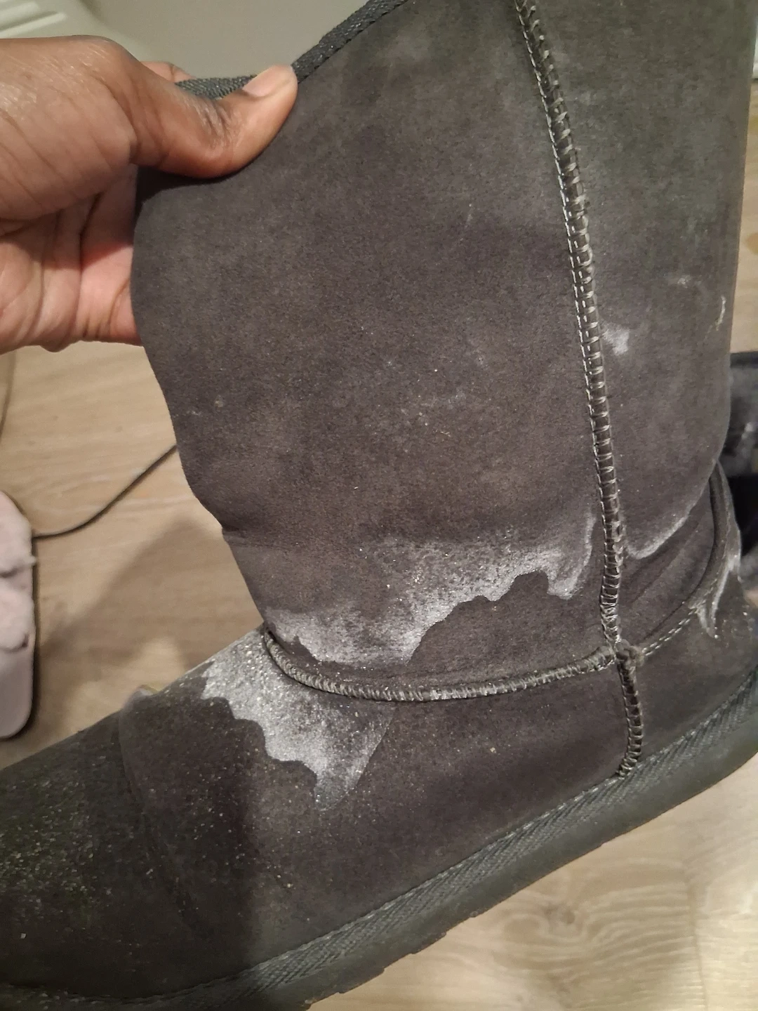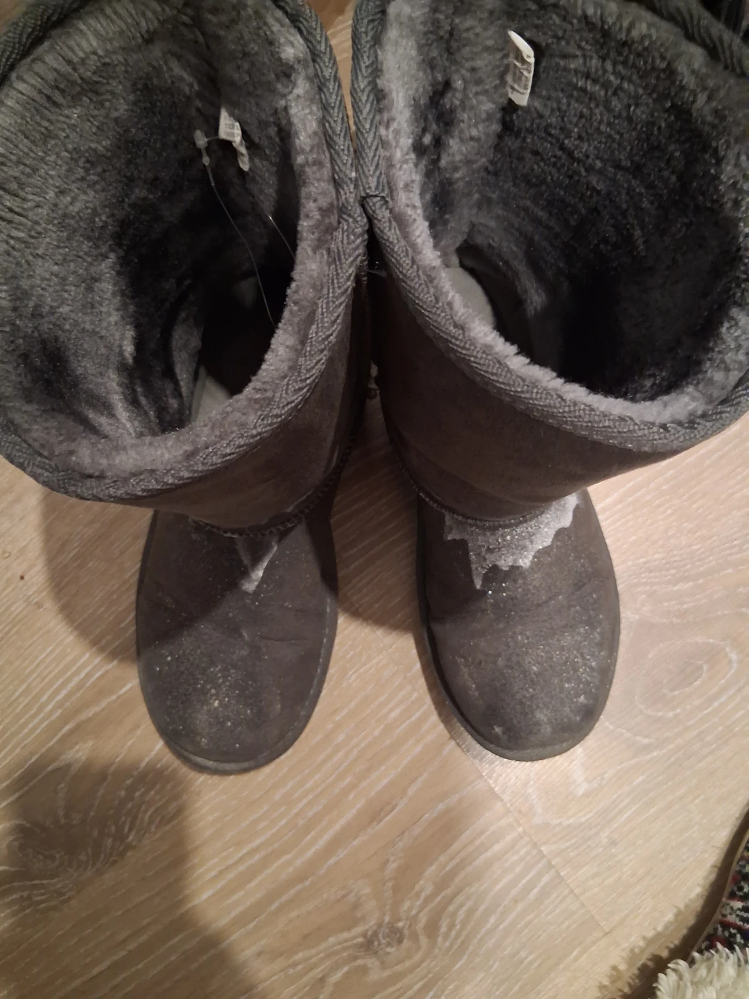 Dark grey suede boots with a cozy faux fur lining. Some white residue present on the exterior of both boots. Perfect for keeping your feet warm on chilly days! Will clean off the snow white mark off it