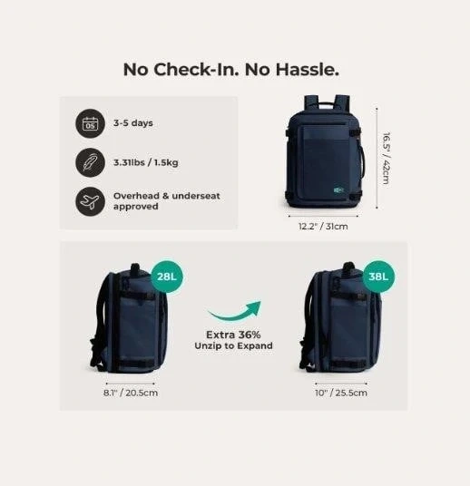 This Bags Mart backpack is navy blue and offers 28L of space. It expands to 38L and fits up to a 15.6" laptop. It's overhead and underseat approved for trips up to 3-5 days.