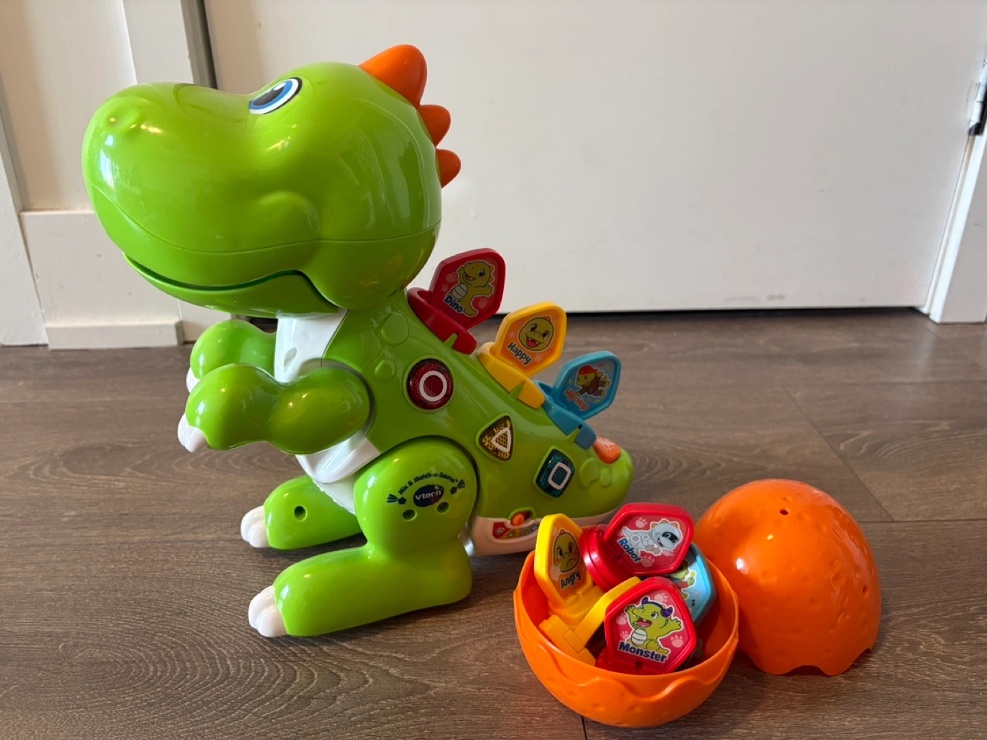 Includes 9 action plates that customize Dino’s voice style (dino, robot, or monster), emotions (happy, angry, or sleepy), and dance styles (ballet, marching, or hip-hop). Comes with the dino egg for storing the plates.