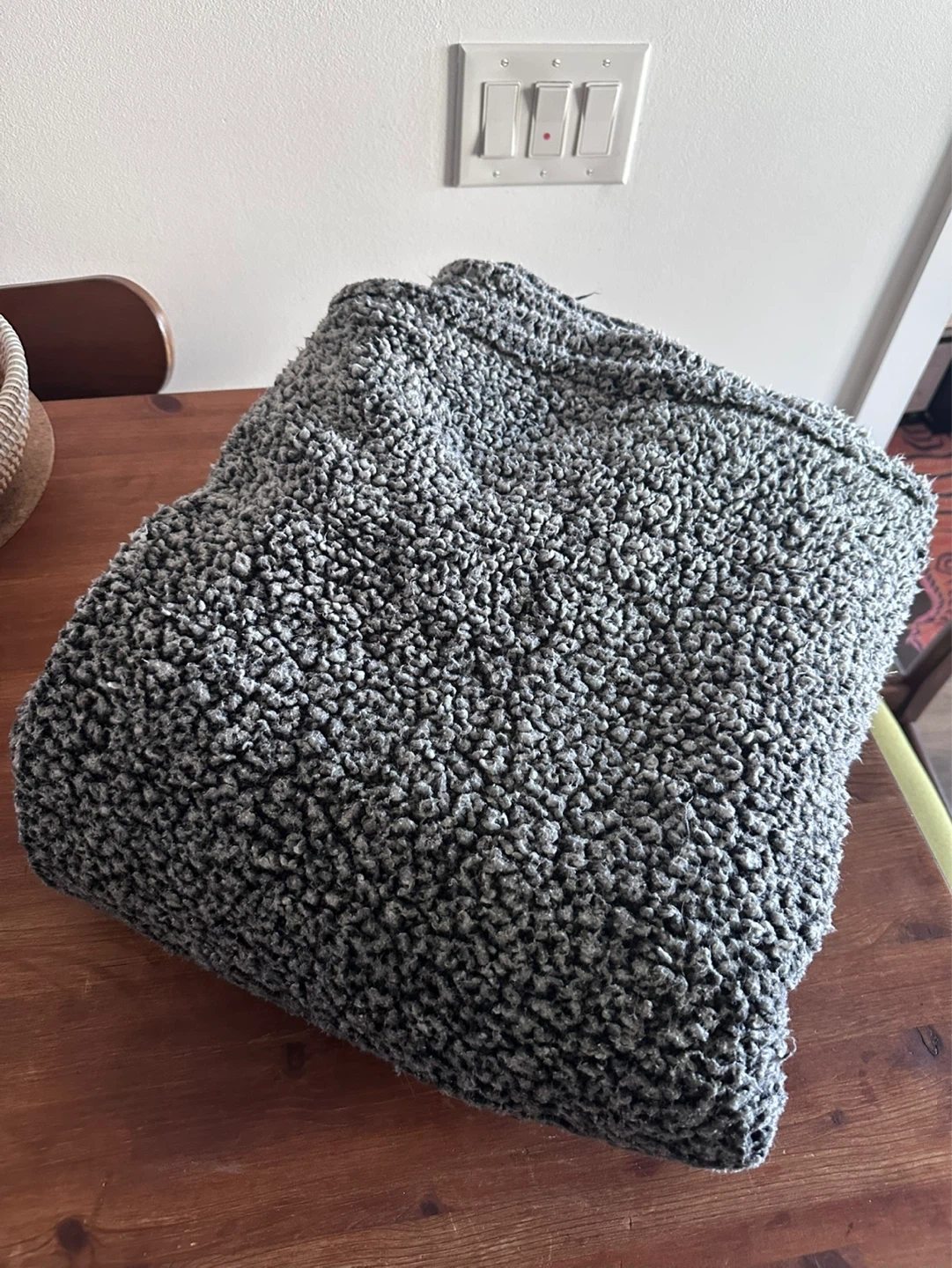 TWO duo-tone grey fleece throw blankets. One is slightly larger than the other and the smaller one has a pocket sewn on it so it can fold up into a throw pillow.