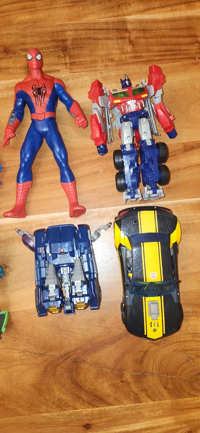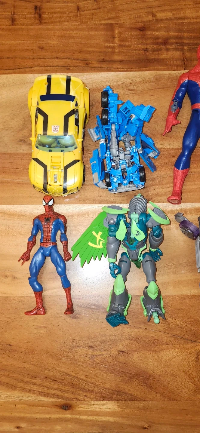 Selling a collection of action figures, including Transformers and Spiderman characters! Some transformers are missing wheels otherwise good.