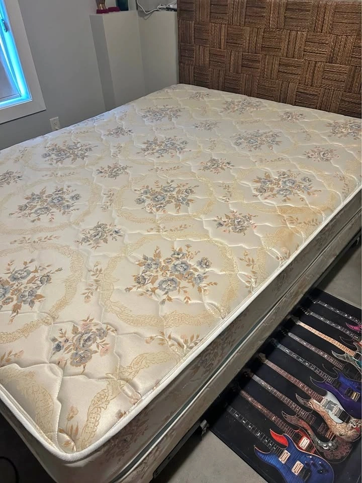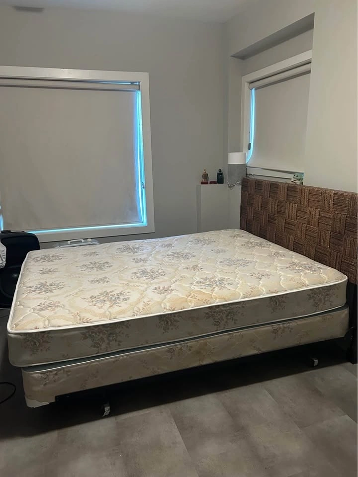 Queen size bed, frame, and box spring. Headboard NOT included. Hardly used, was in a spare bedroom. Let me know if you're interested!