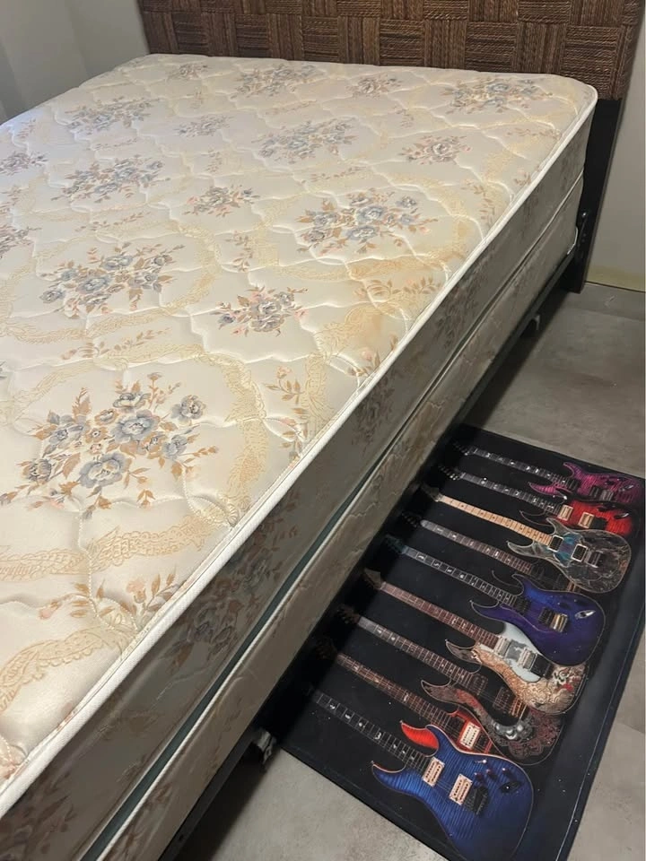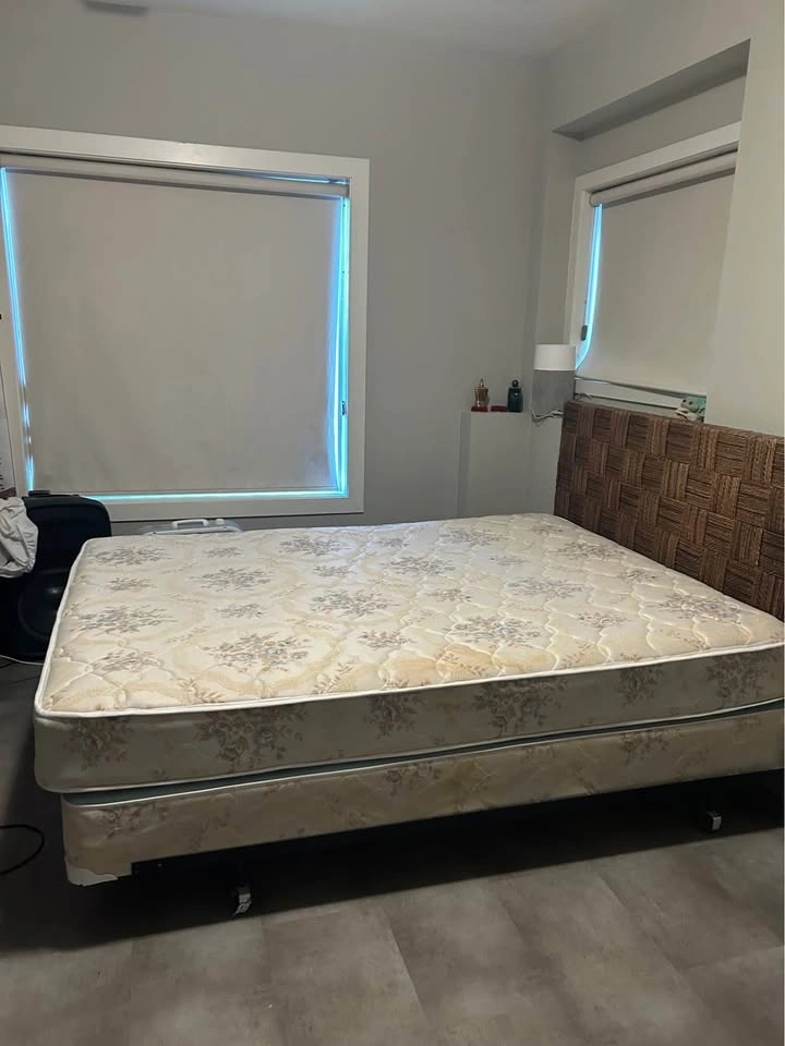 Queen size bed, frame, and box spring. Headboard NOT included. Hardly used, was in a spare bedroom. Let me know if you're interested!