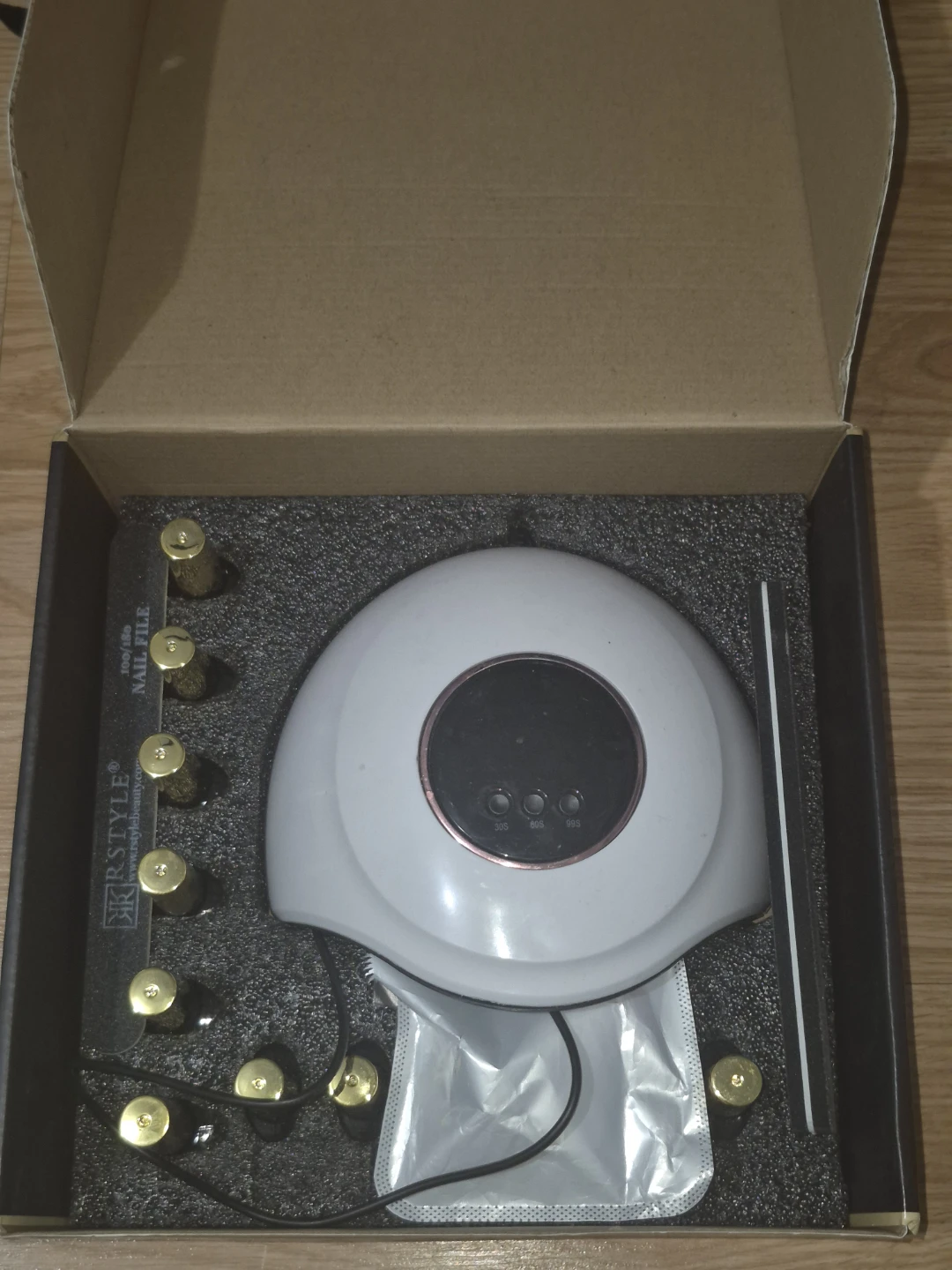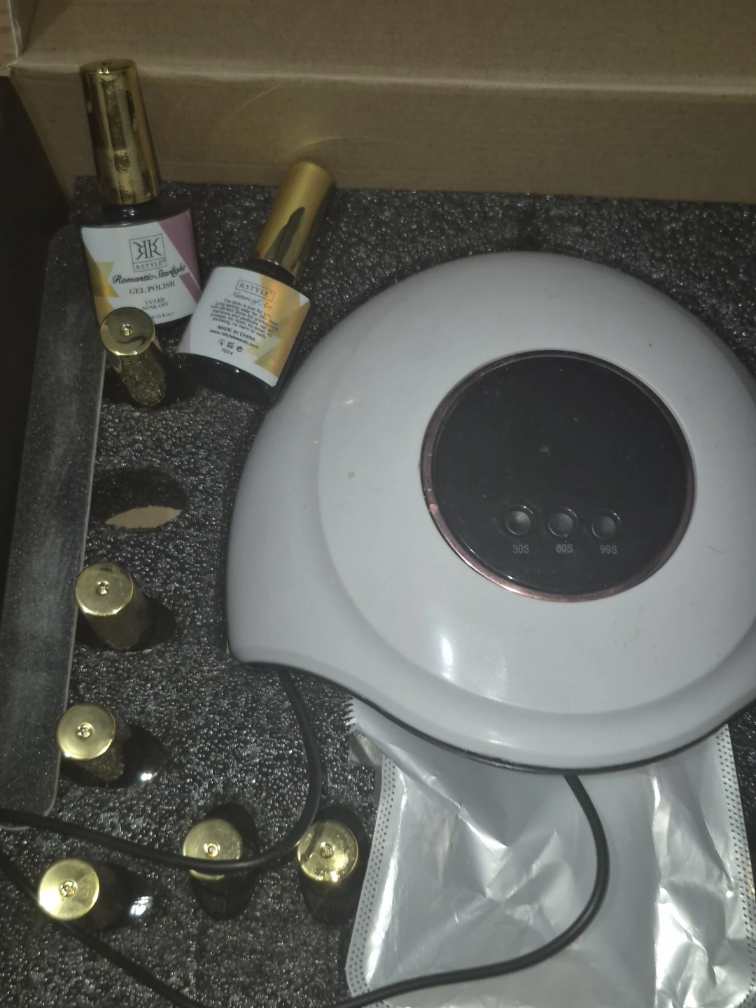 This is a set including an RSTYLE UV lamp and two bottles of Romantic Starlight gel polish. It also comes with several small accessories with gold tops, and a nail file. The lamp has 30, 60, and 90-second timers.