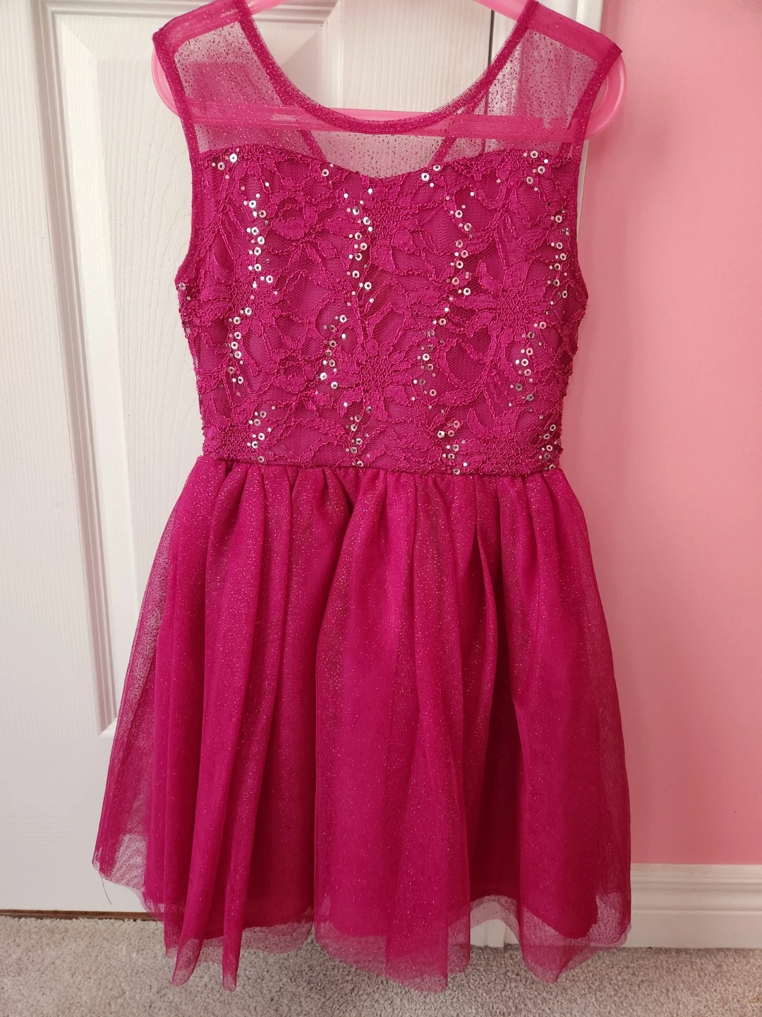 A lovely pink dress with sparkly sequin details and a lace overlay on the bodice. It features a sheer sparkly neckline and sleeves. The skirt is made of layered tulle, giving it a full, twirly look. Perfect for parties or special occasions!