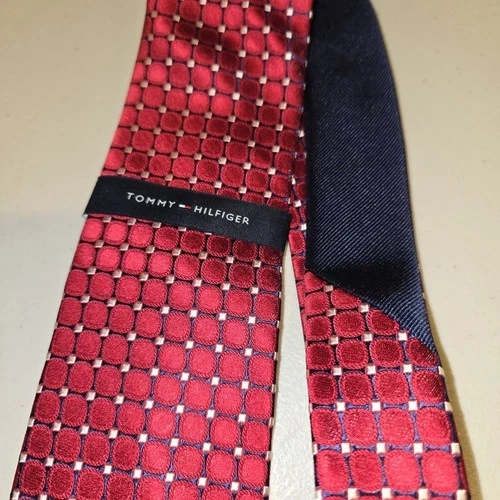 This Tommy Hilfiger Silk Tie in red and blue geometric square design is a stylish and classic accessory for men. Made from 100% silk with a woven fabric type, this designer tie features the brand's logo accents and a preppy theme. The adjustable tie has a classic length of 57"-60" and a classic width, offering a timeless and sophisticated look perfect for any occasion.
