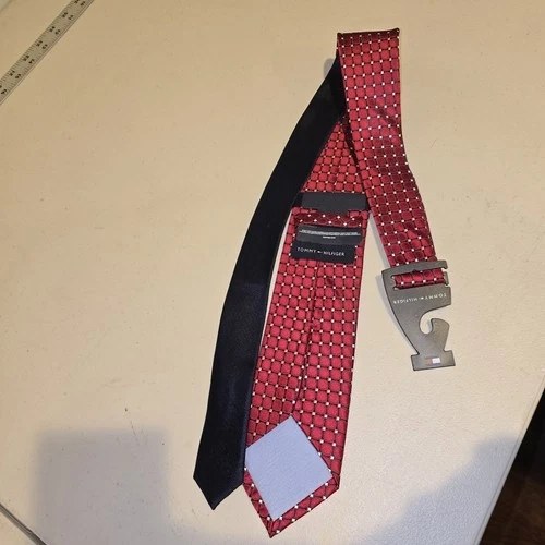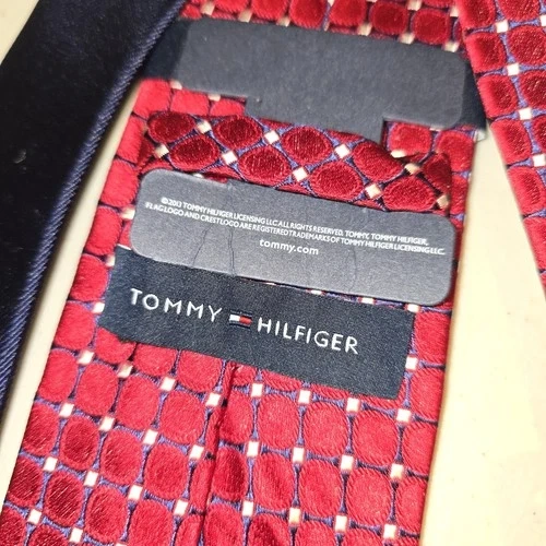 This Tommy Hilfiger Silk Tie in red and blue geometric square design is a stylish and classic accessory for men. Made from 100% silk with a woven fabric type, this designer tie features the brand's logo accents and a preppy theme. The adjustable tie has a classic length of 57"-60" and a classic width, offering a timeless and sophisticated look perfect for any occasion.