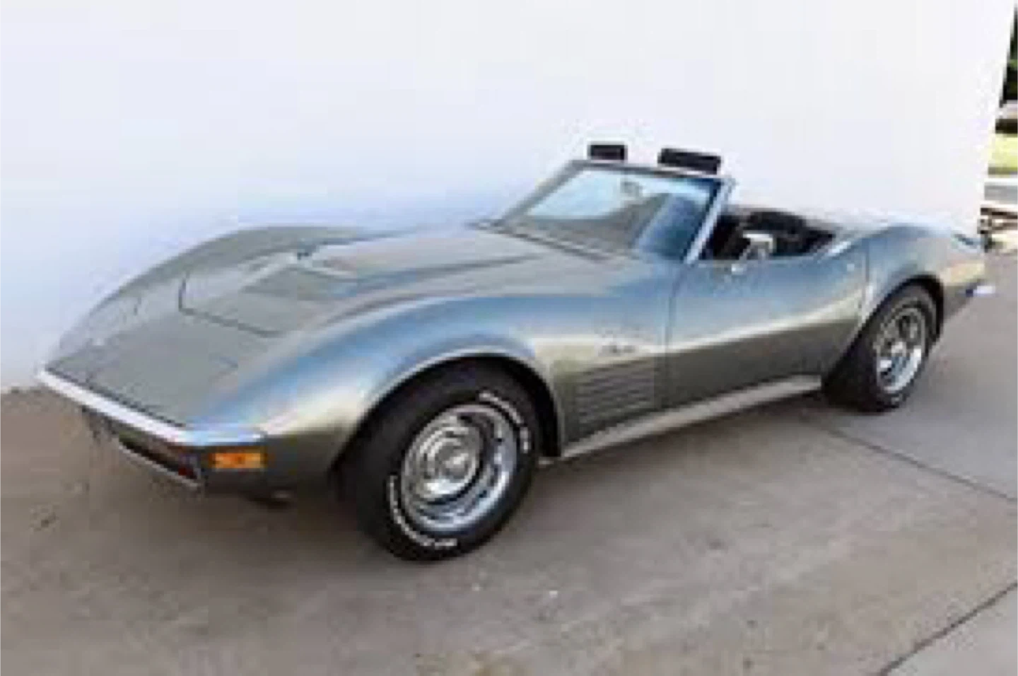 This is a classic Chevrolet Corvette convertible with a sleek, metallic grey finish. It's a stylish ride for cruising. This beauty is sure to turn heads on the road!