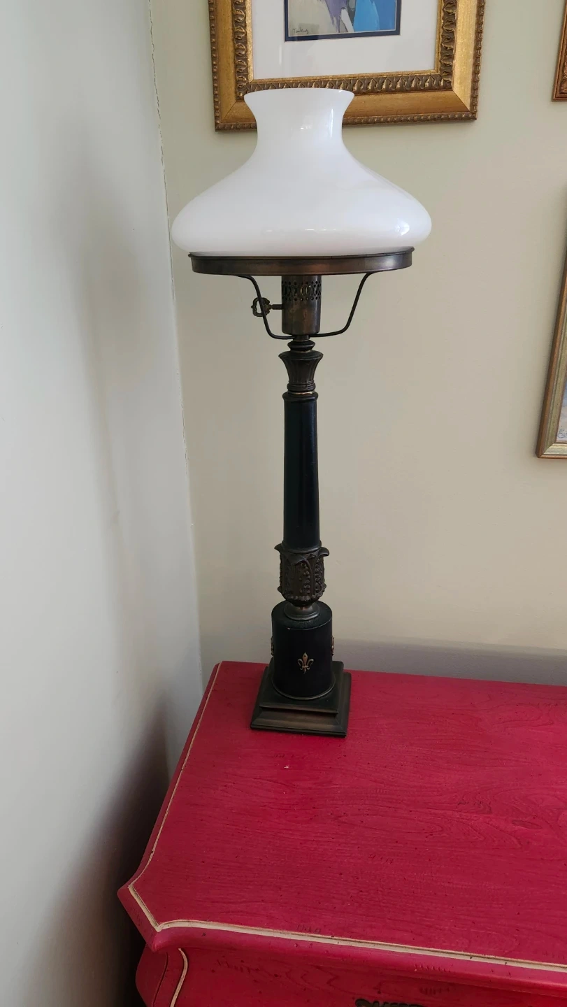 This classic table lamp features a white globe shade and a decorative base with ornate accents. It's made with a dark column and bronze-tone metal details. This lamp adds a touch of vintage charm to any room. It's a lovely accent piece for a side table or desk.