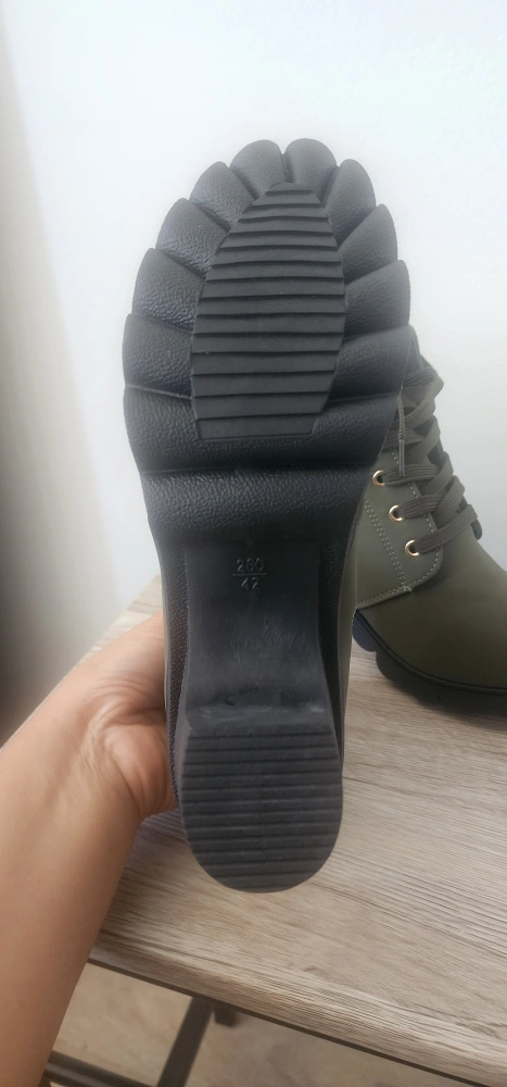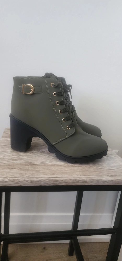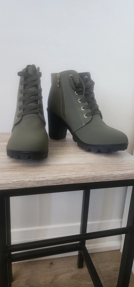 These cute olive green ankle boots are in great condition! They feature a lace-up front, a side zipper, and a sturdy block heel. Perfect for adding a bit of edge to any outfit. Never worn.