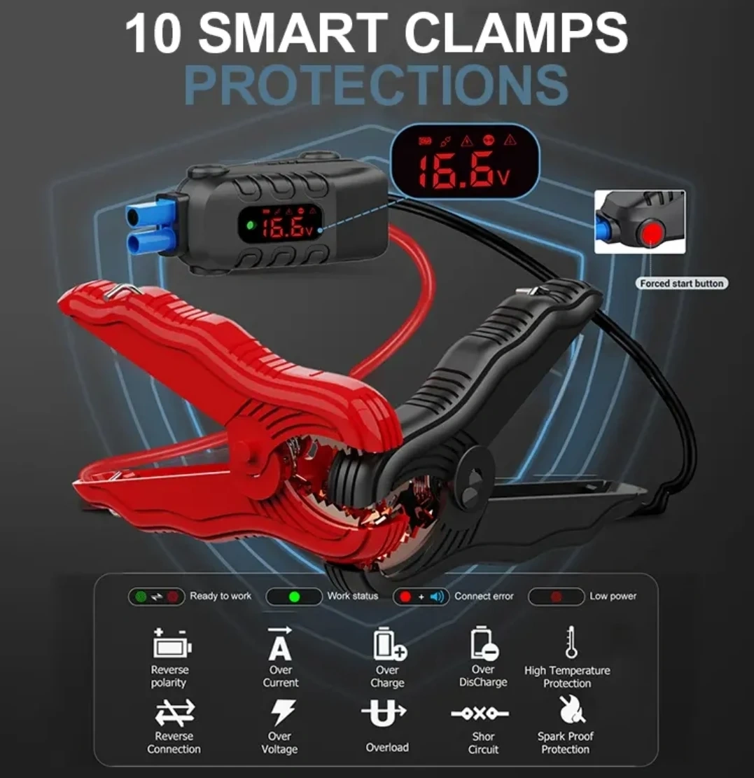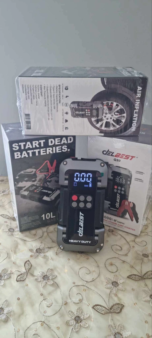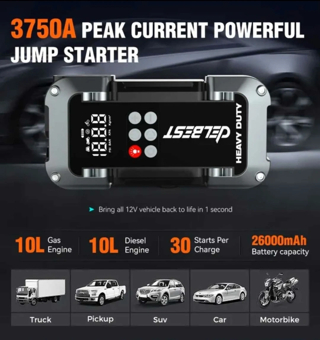 This DELBEST HEAVY DUTY jump starter provides 3750A peak current for gas and diesel engines. It boasts a 26000mAh battery capacity and also functions as an air inflator for tires. It offers 10 smart clamp protections.