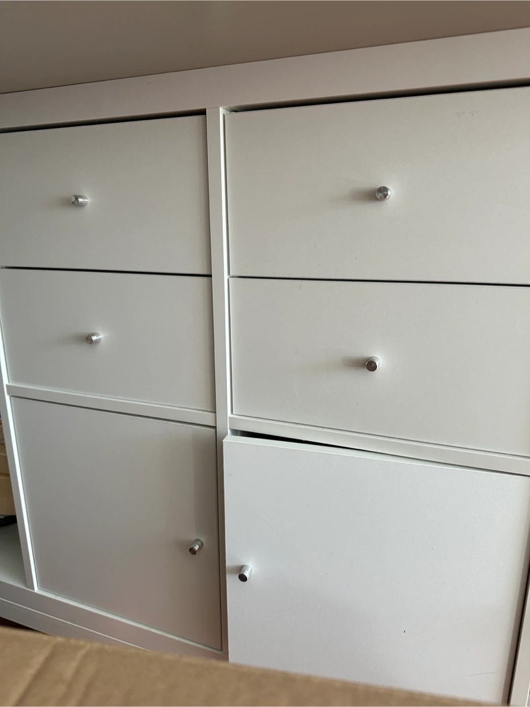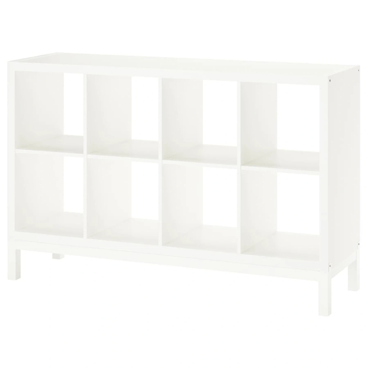 White (not the high shine one) IKEA Kallax shelf unit with eight cube compartments.