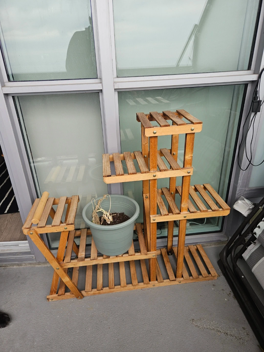 Wooden tiered plant stand. Multiple levels provide ample space for your plants. It's made of wood with a natural finish. This stand is great for balconies or patios!