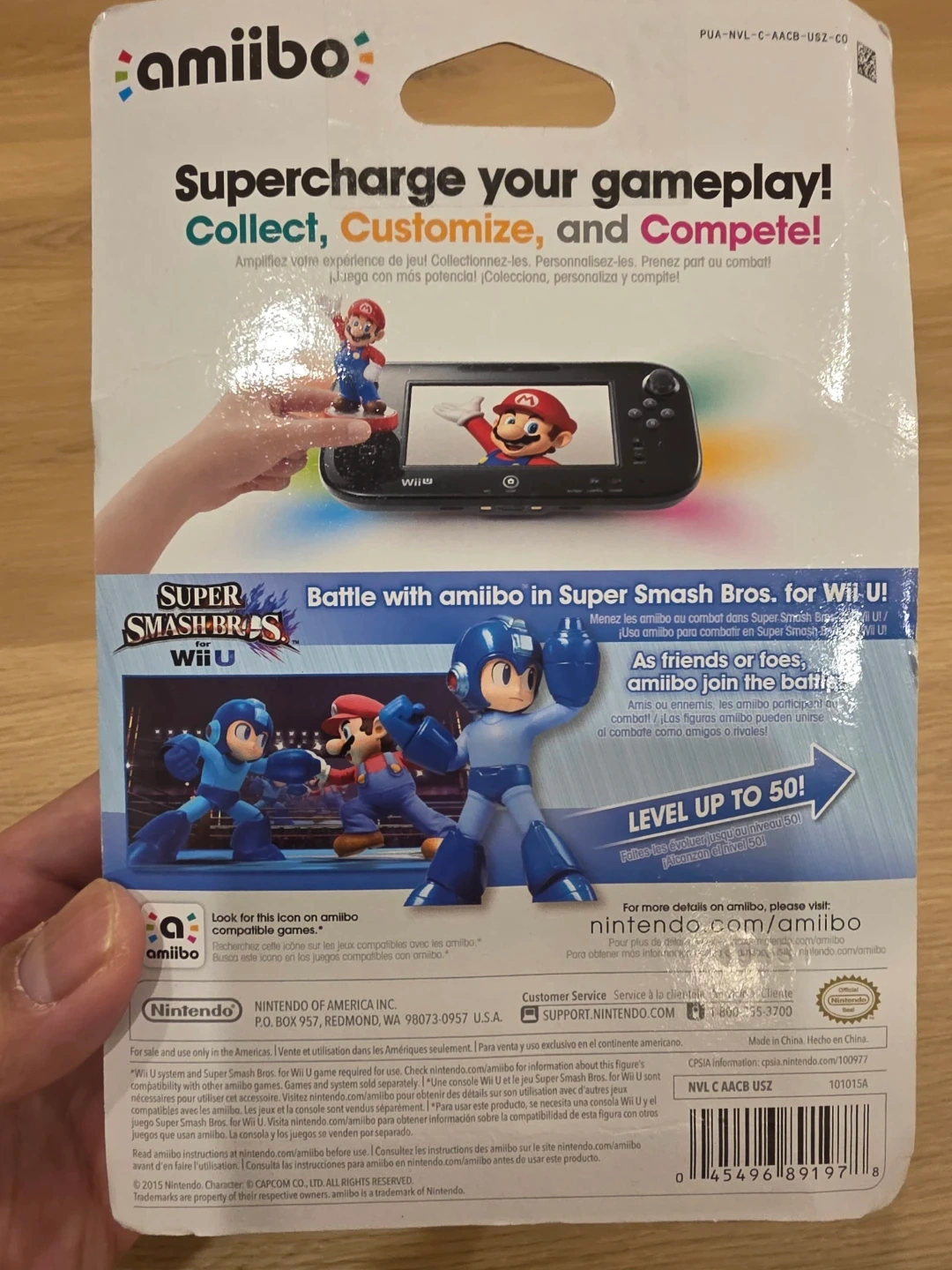 This is a Nintendo Amiibo figure featuring Mega Man from Super Smash Bros. It's compatible with Wii U and other amiibo-compatible games. Level up to 50!