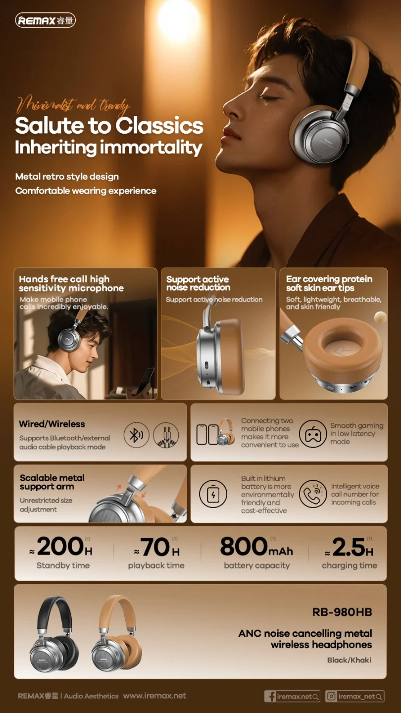 These REMAX RB-980HB headphones offer ANC noise cancelling and a metal retro style design. They support Bluetooth and wired connections, with a scalable metal support arm for adjustable size. Battery capacity is 800mAh for up to 70 hours playback.