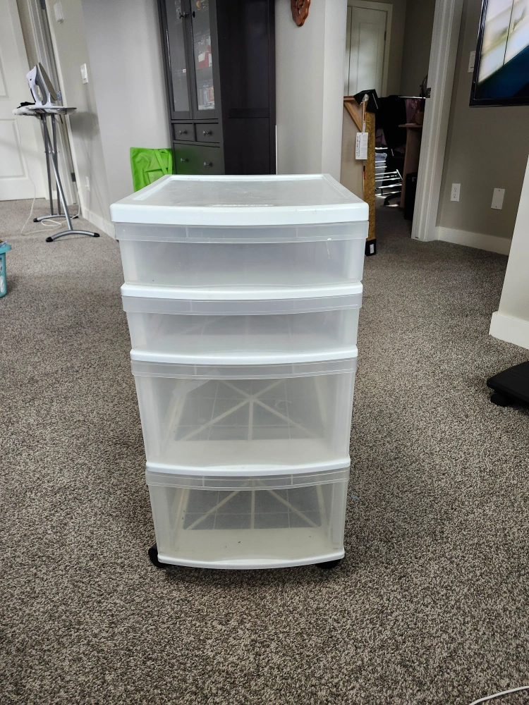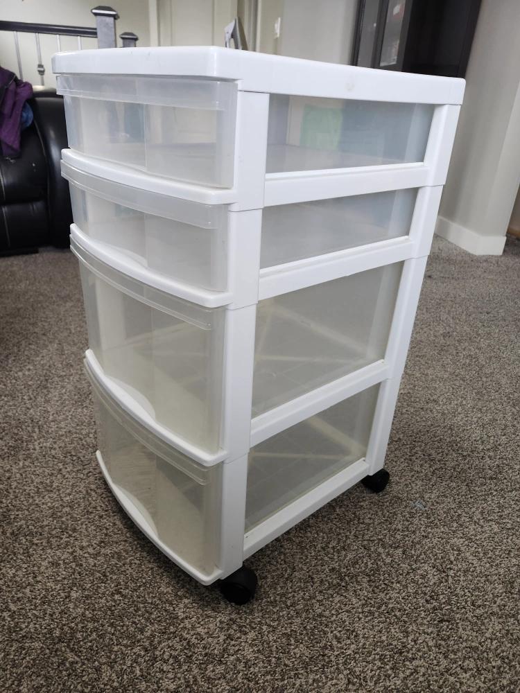Four-drawer plastic storage unit. Clear drawers, white frame. Wheels for mobility. Great for organizing. pet and smoke free