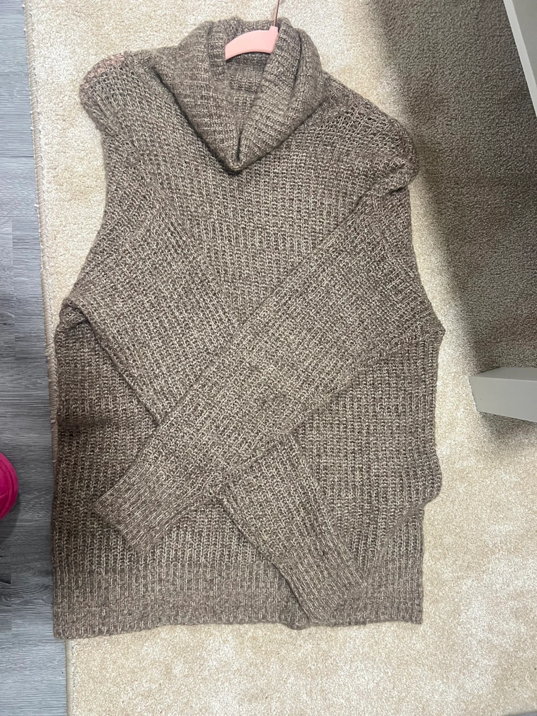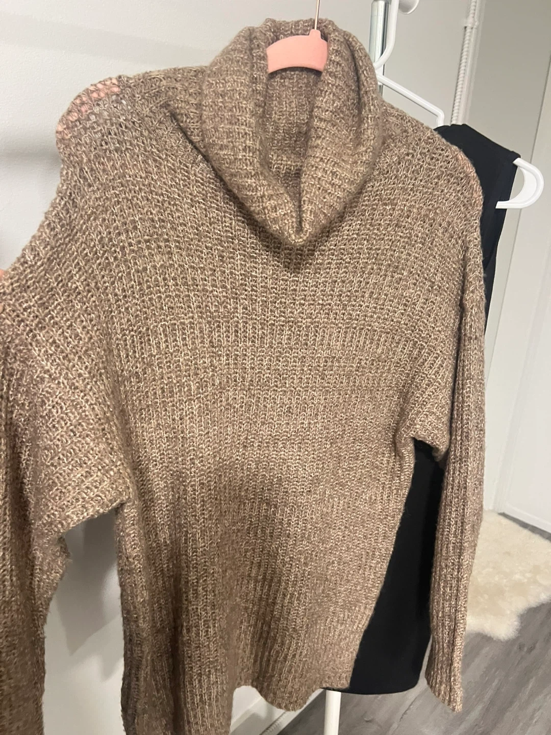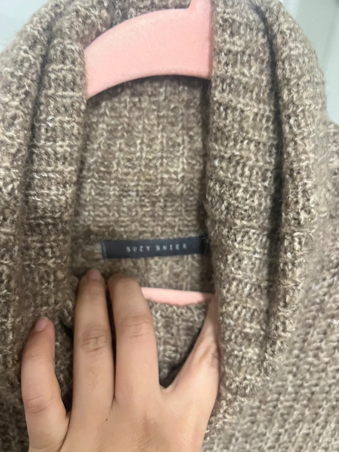 Cozy knit sweater from Suzy Shier with a cowl neck. It's a warm, earthy brown colour. Perfect for cooler weather!