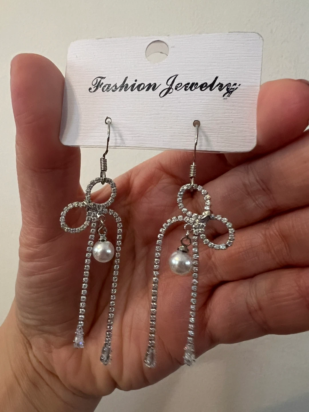 Sparkly fashion jewelry drop earrings featuring faux pearls and clear rhinestones and S925 post. These dangly earrings have a silver-tone finish. They're lightweight and perfect for adding a touch of glam to your outfit!