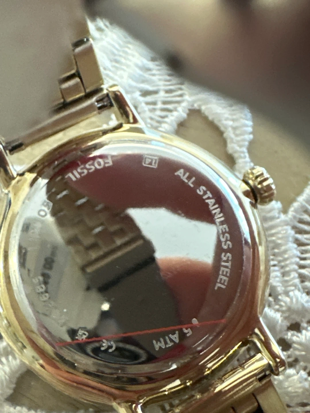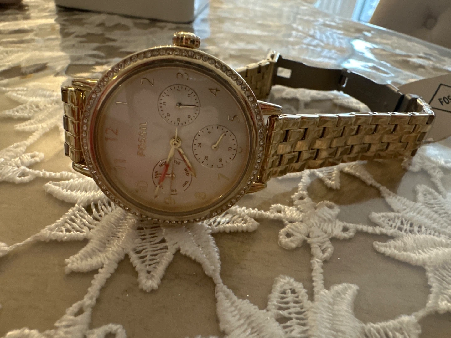 This is a gold Fossil watch with a stainless steel band. It's a stylish timepiece featuring a crystal-embellished bezel. The watch has multiple subdials for day, date, and 24-hour indication.