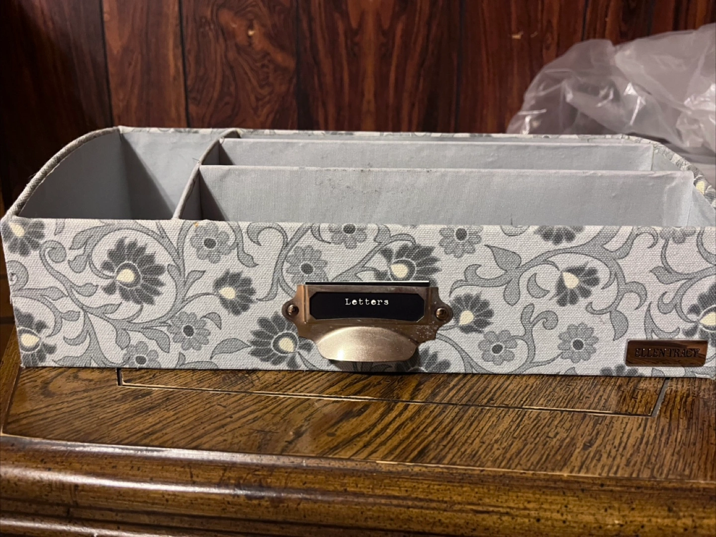 Keep your desk tidy with this Ellen Tracy letter organizer! It features a pretty floral pattern in shades of grey and white. Perfect for sorting mail or organizing papers in your home office