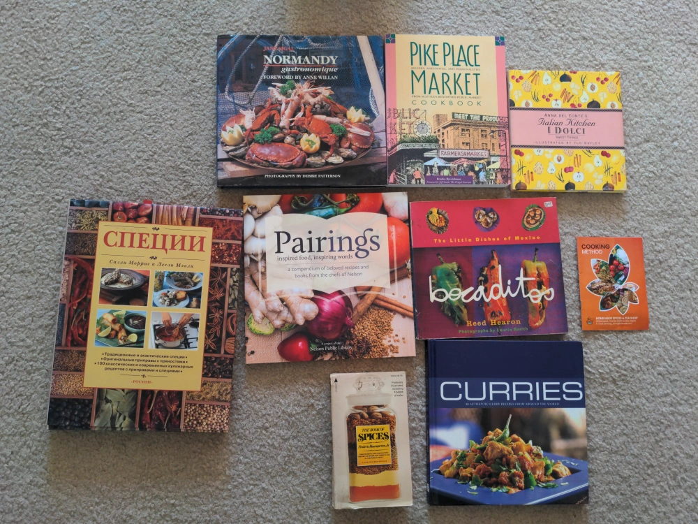 This is a collection of 7 cookbooks covering various cuisines and culinary topics. They include 'Normandy Gastronomique', 'Pike Place Market Cookbook', 'Anna Del Conte's Italian Kitchen: I Dolci', 'Специи' (Spices in Russian), 'Pairings', 'Bocaditos: The Little Dishes of Mexico', and 'Curries'.