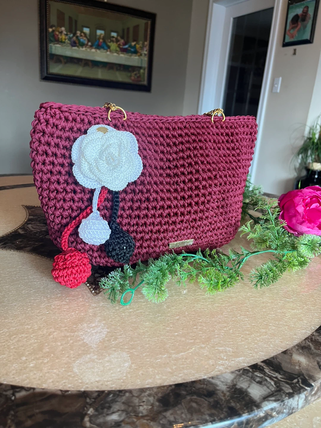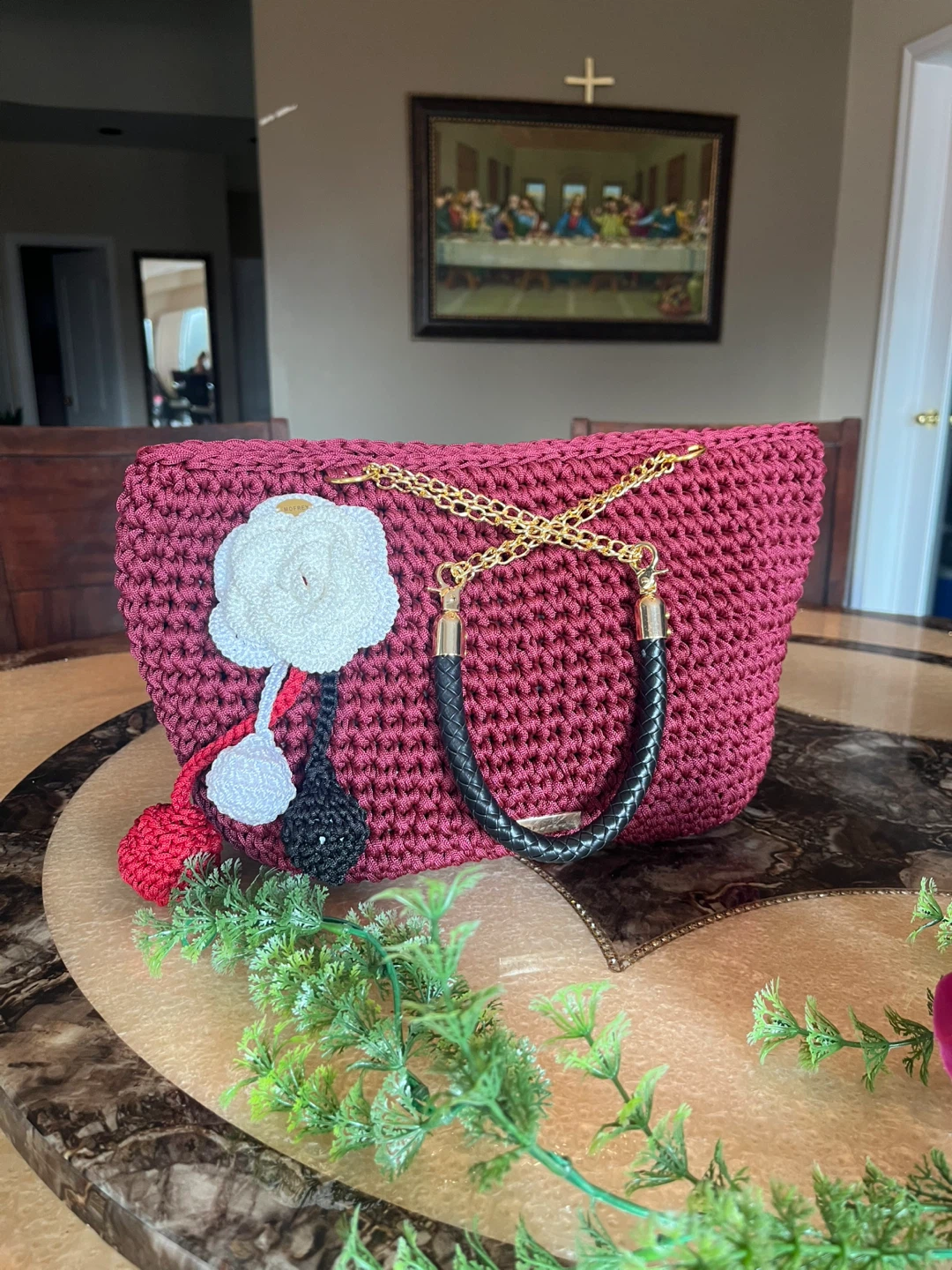 Check out this beautiful handmade crochet tote bag! It's a unique piece, perfect for adding a touch of handcrafted charm to your outfit. The burgundy colour is so rich and stylish, and the crochet texture gives it a lovely, artisanal feel.