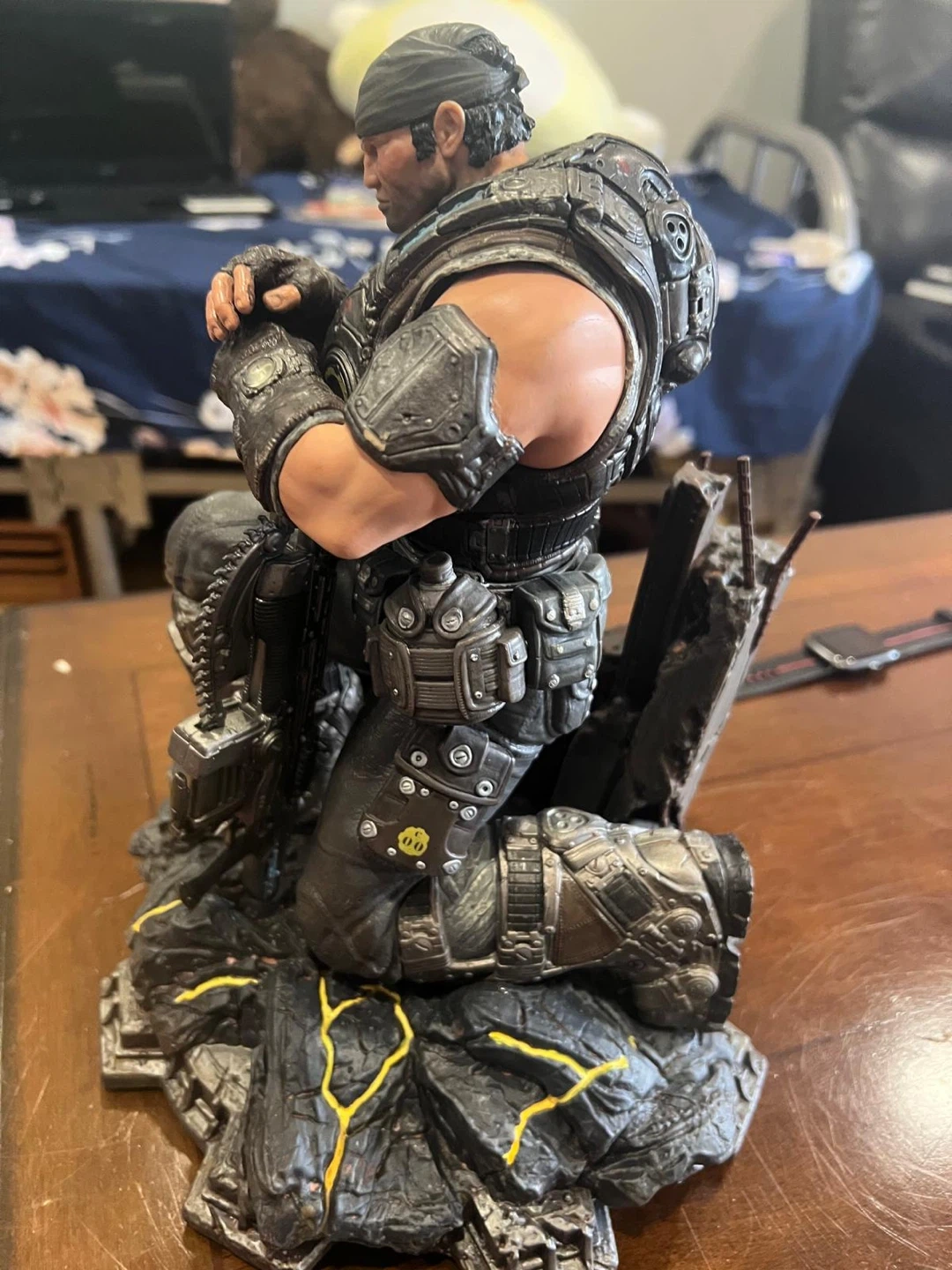This is a detailed statue of Marcus Fenix from Gears of War. It depicts him kneeling with his iconic Lancer rifle. The base features rubble and glowing yellow accents.