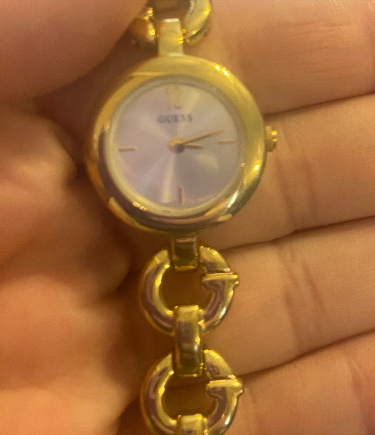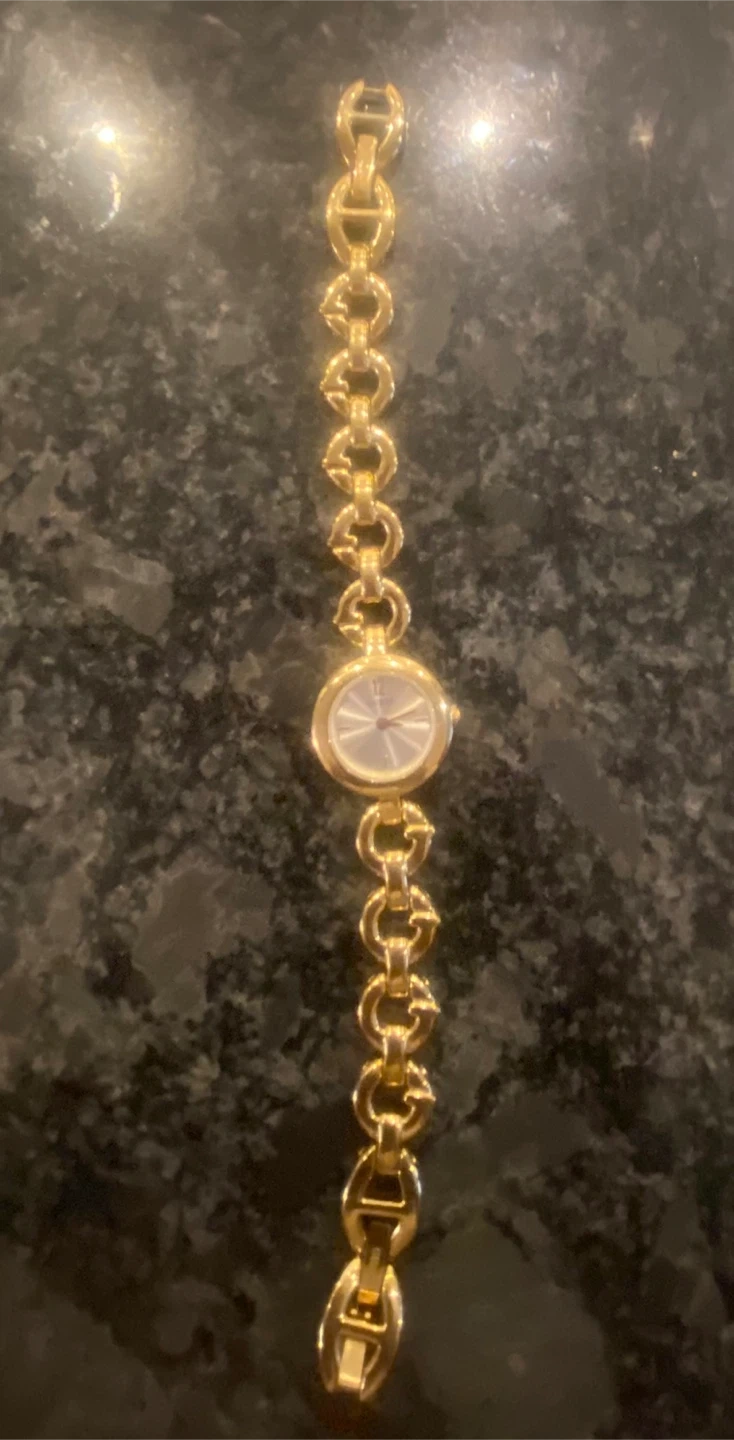 Selling a beautiful classic Guess ladies' watch with a gold-tone finish! The watch features a unique chain-link bracelet design with the 'G' logo incorporated into the links. Needs new battery.