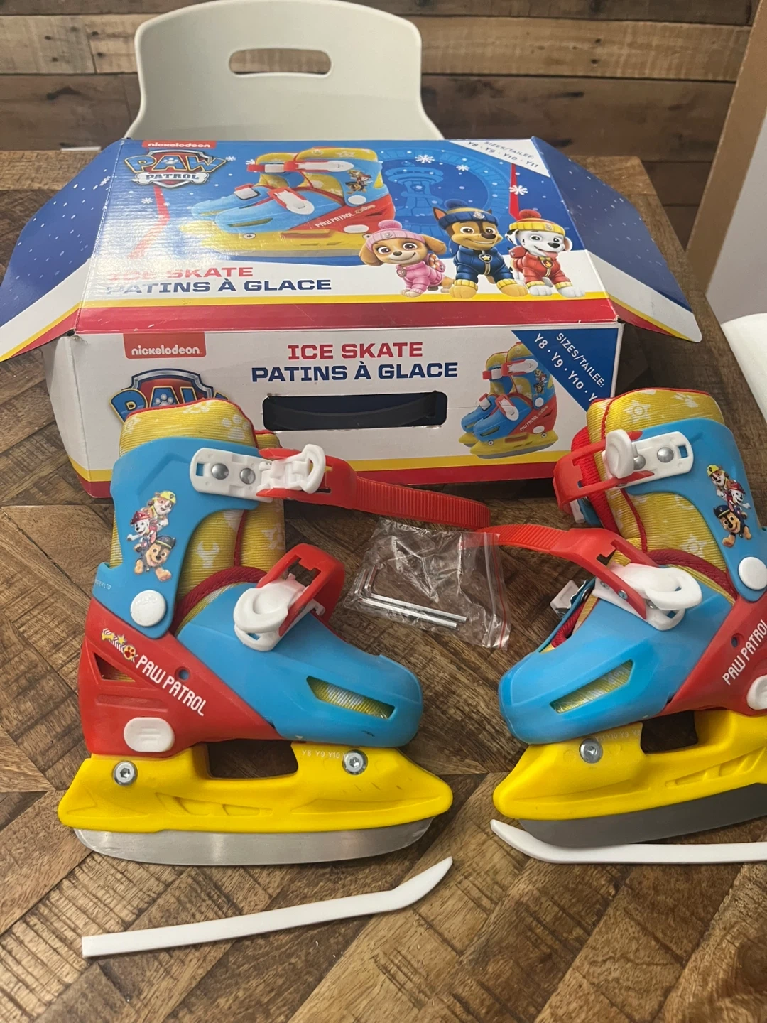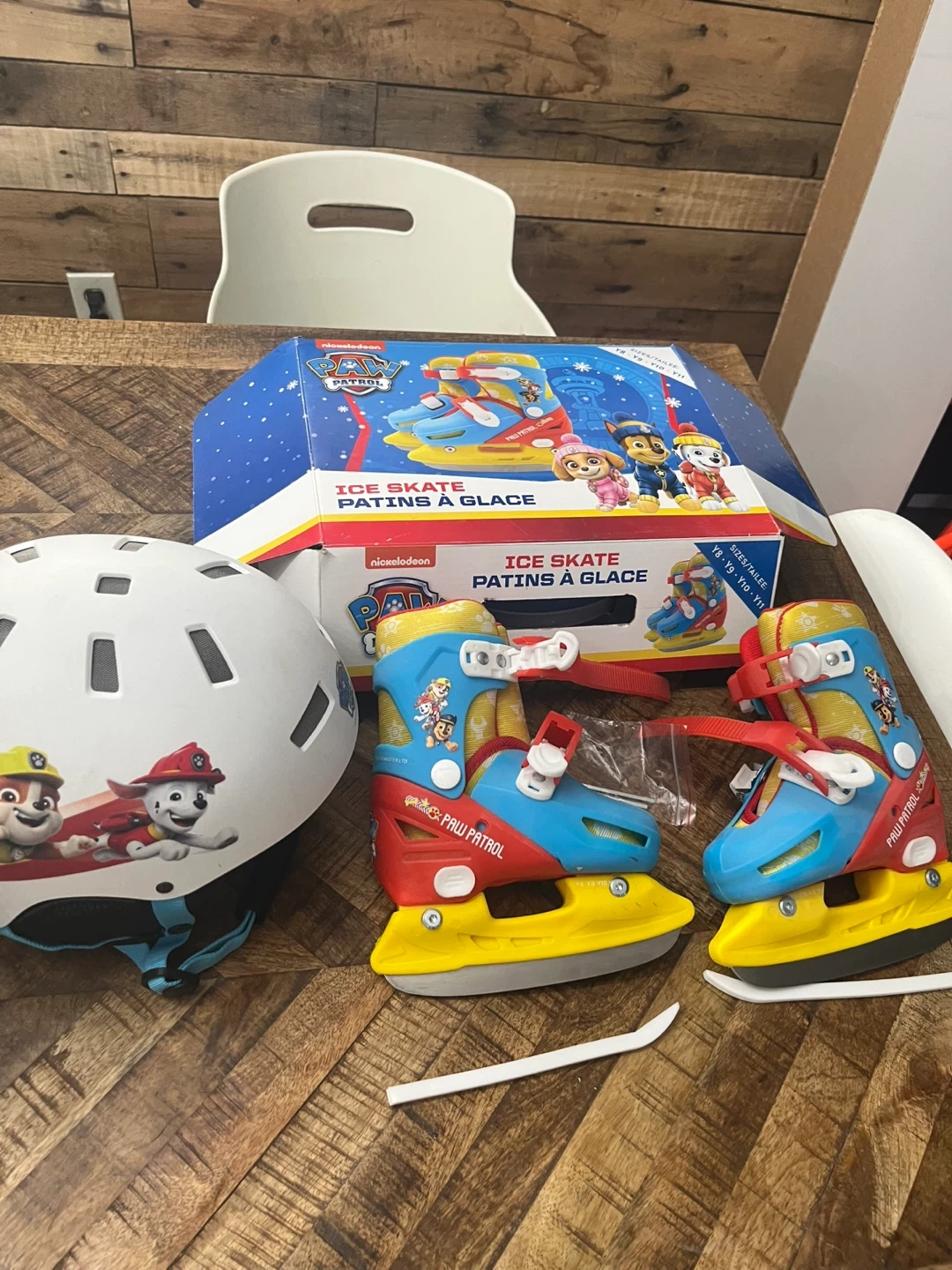 Nickelodeon Paw Patrol ice skates and helmet set for kids! The skates are adjustable y8-y11 and come with a helmet featuring Paw Patrol characters. This set is perfect for young fans learning to skate. Skates have been sharpened and are ready to use. Never used.